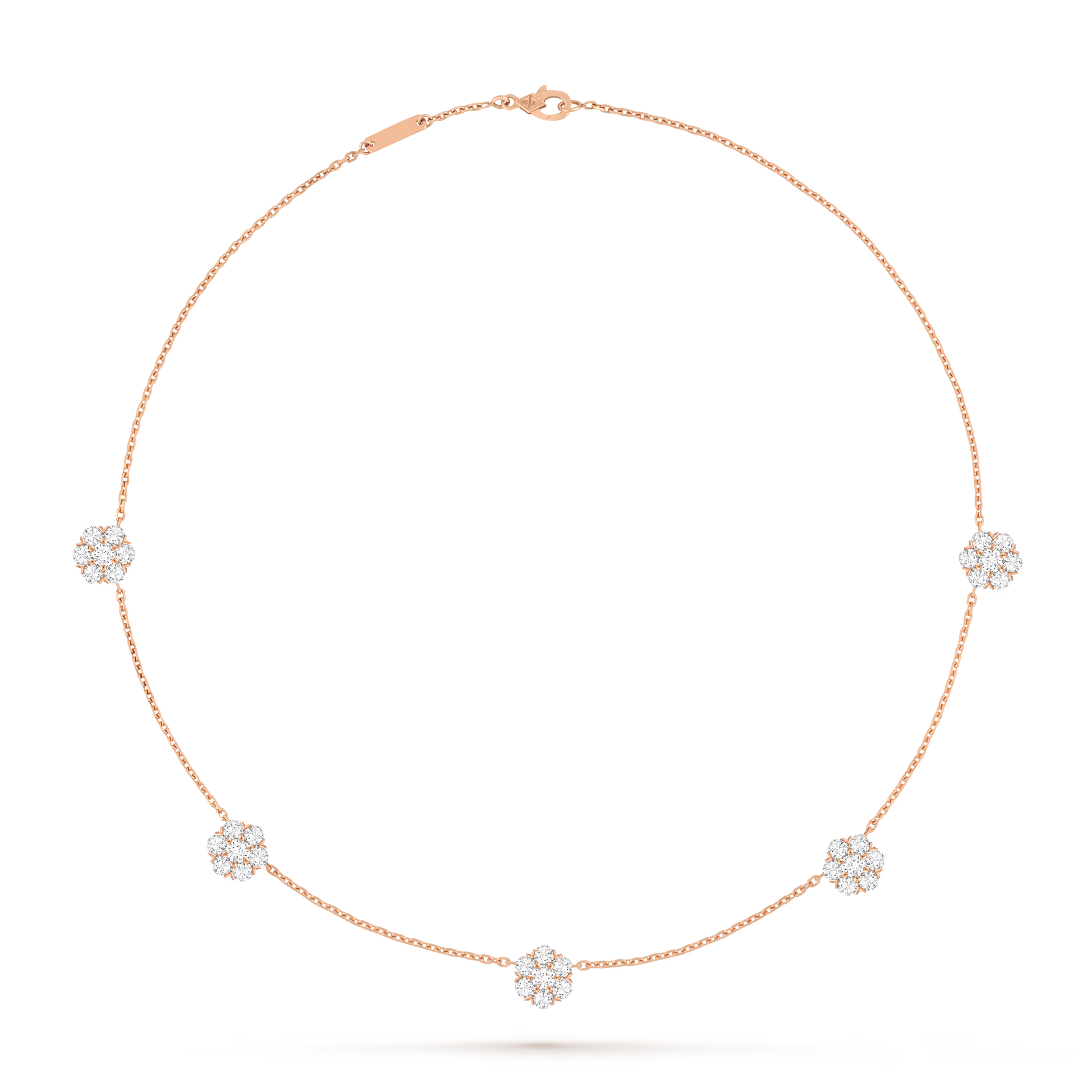 Fleurette necklace, 5 flowers, 18K rose gold, round diamonds.