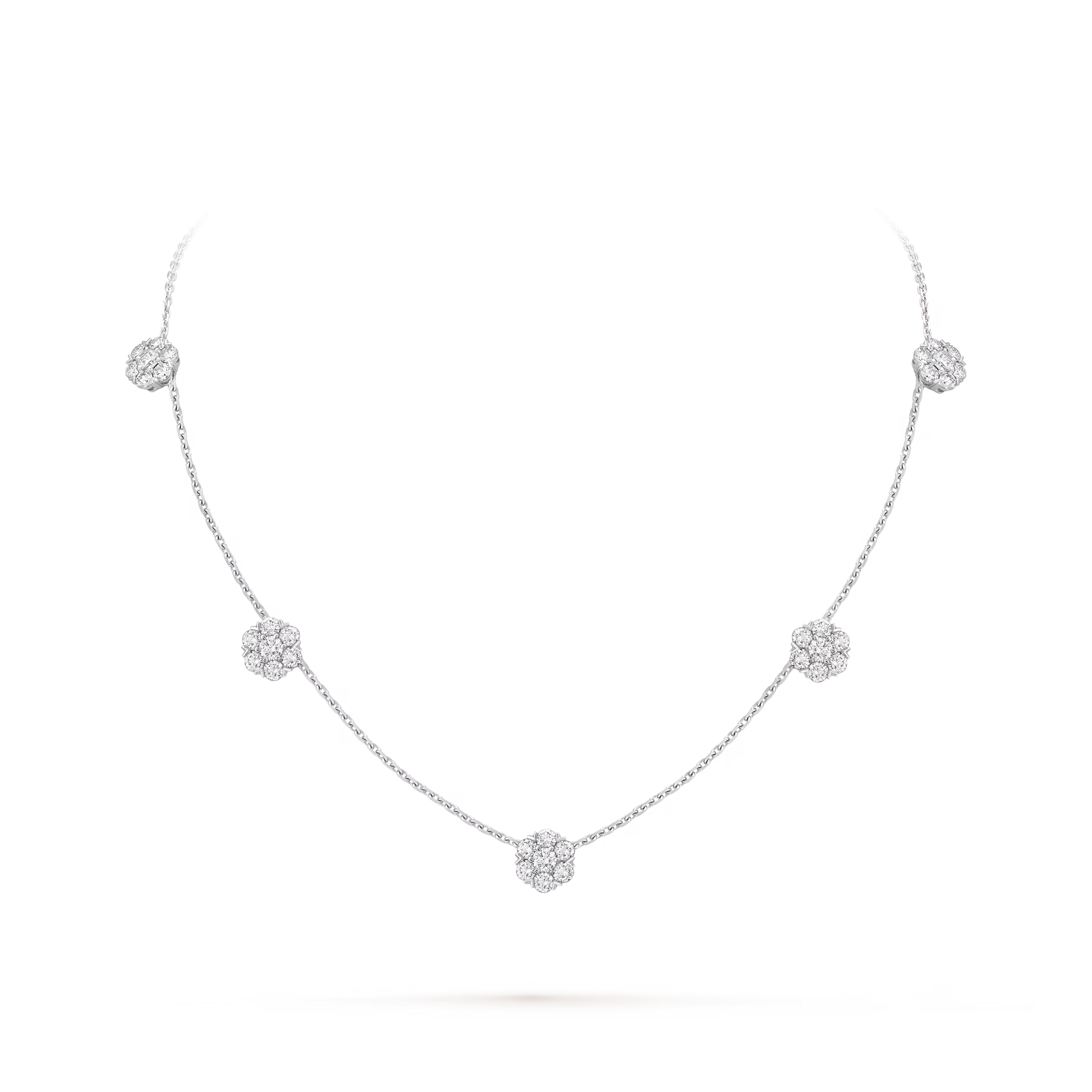 Fleurette necklace, 5 flowers, rhodium plated 18K white gold, round diamonds.
