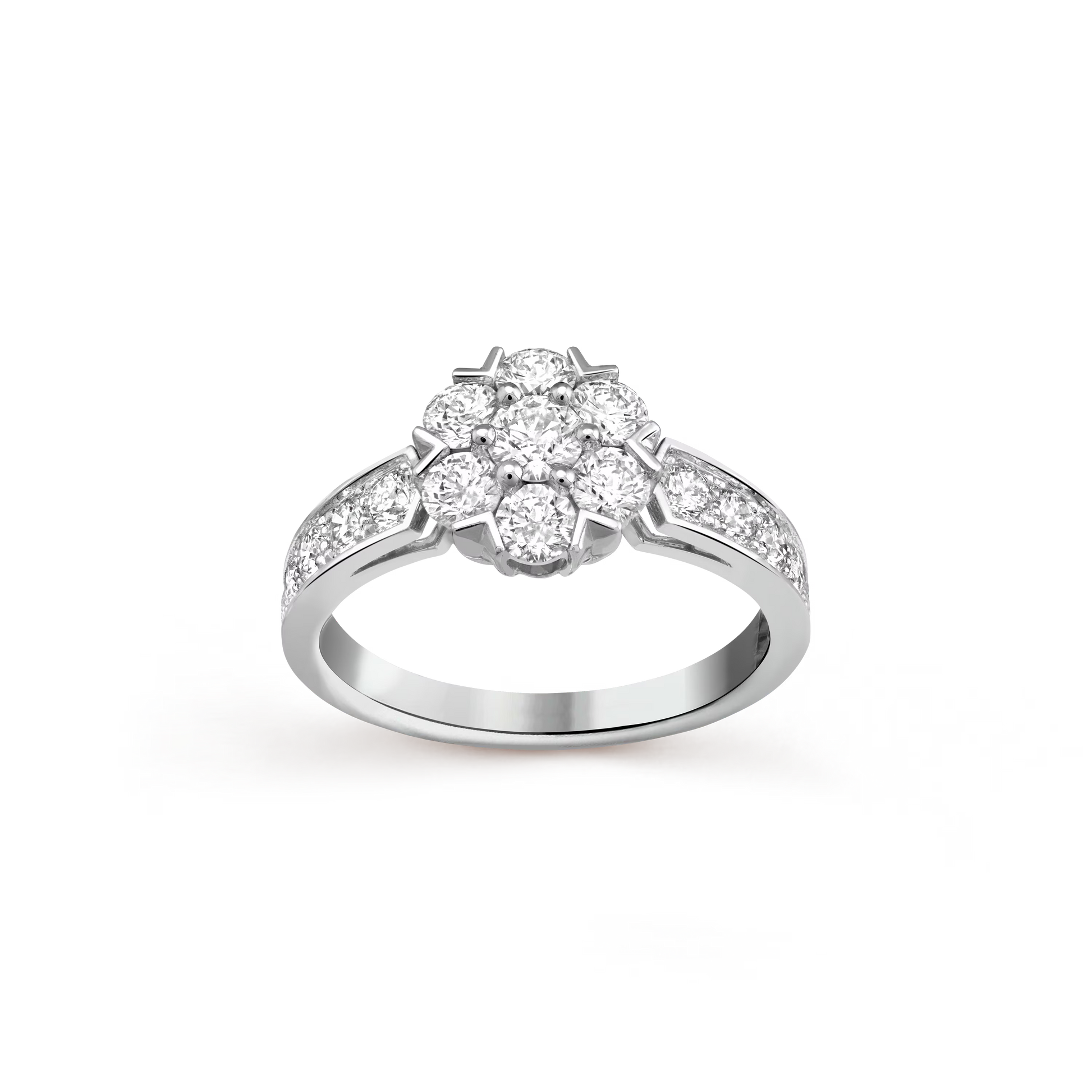 Fleurette ring, rhodium plated 18K white gold, round diamonds.