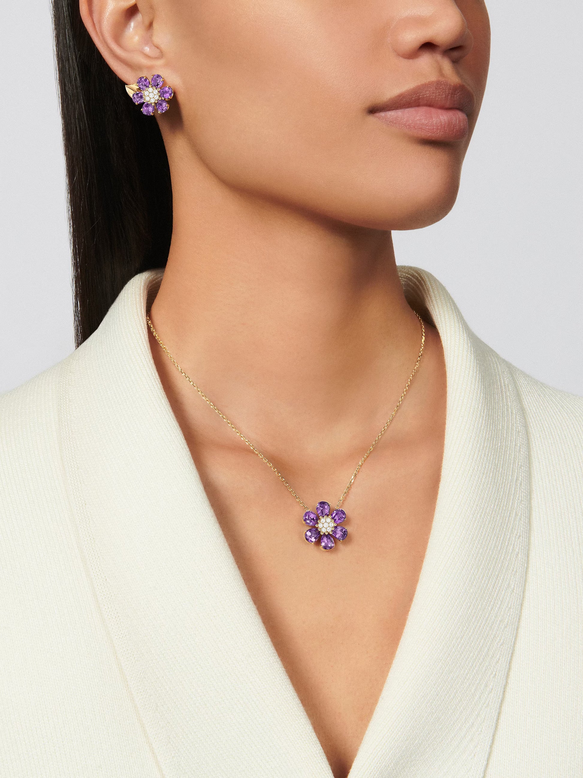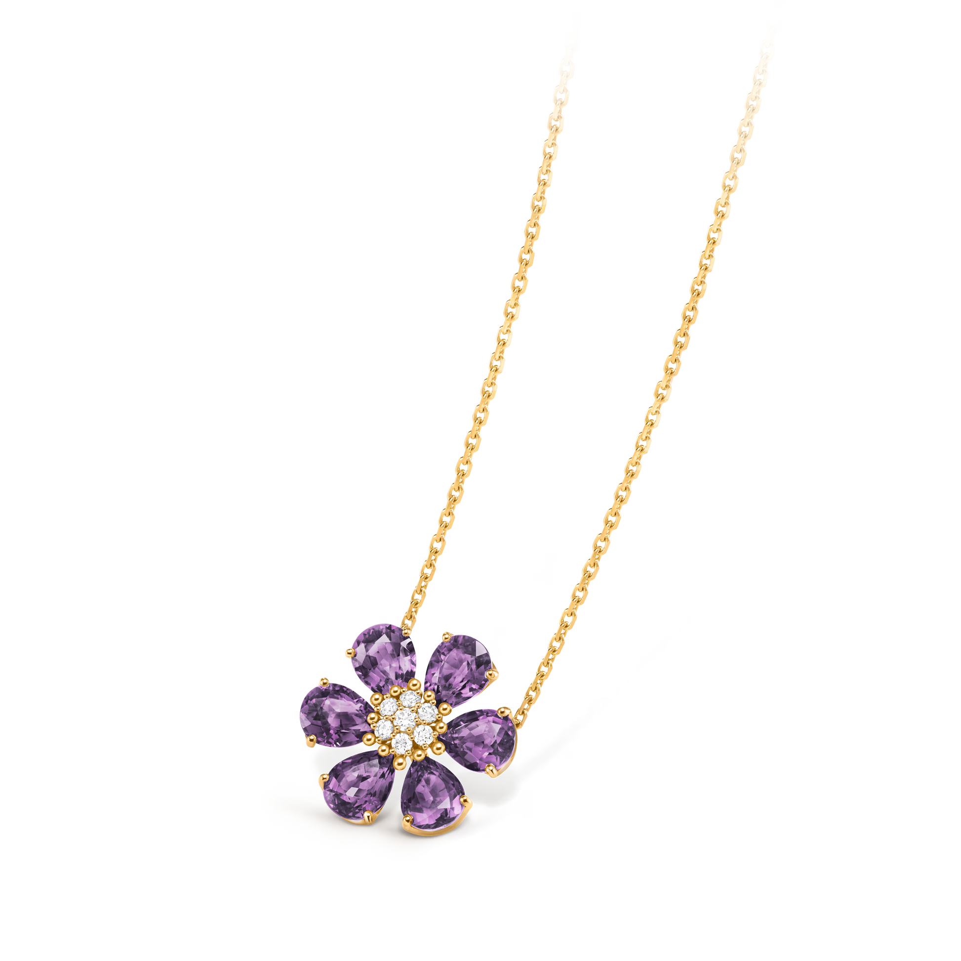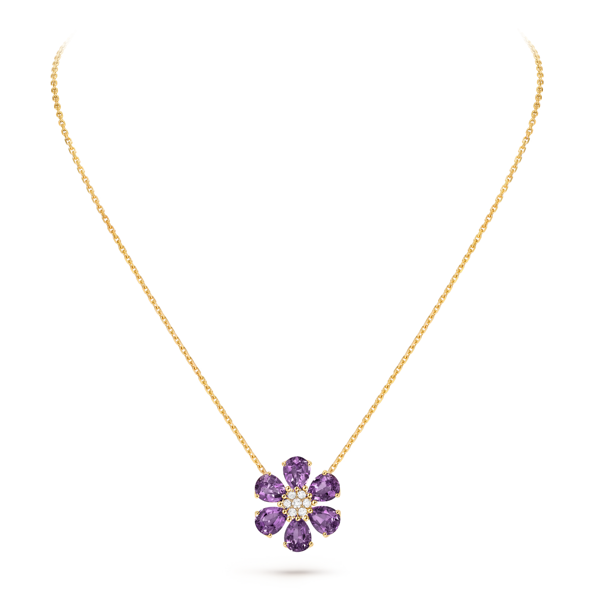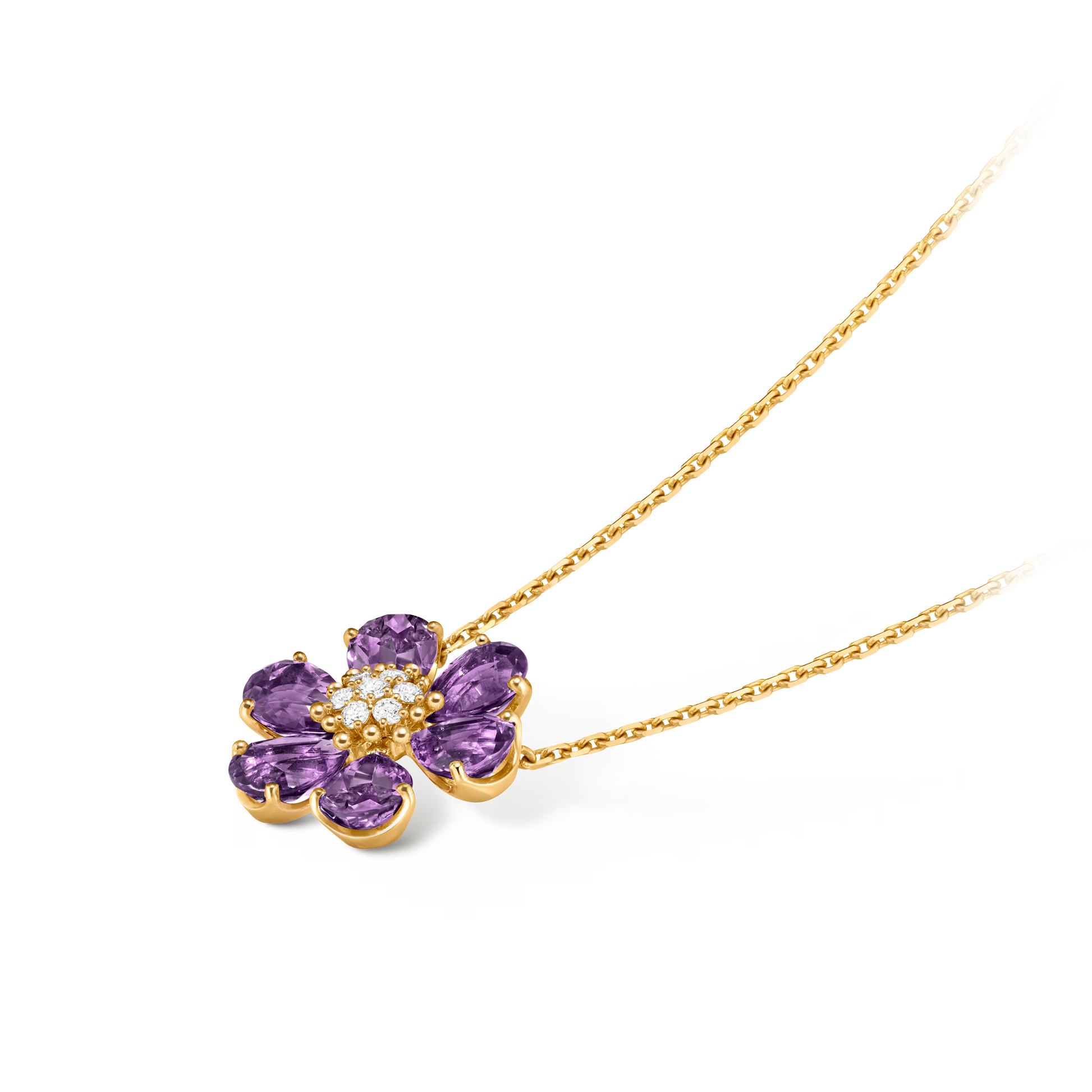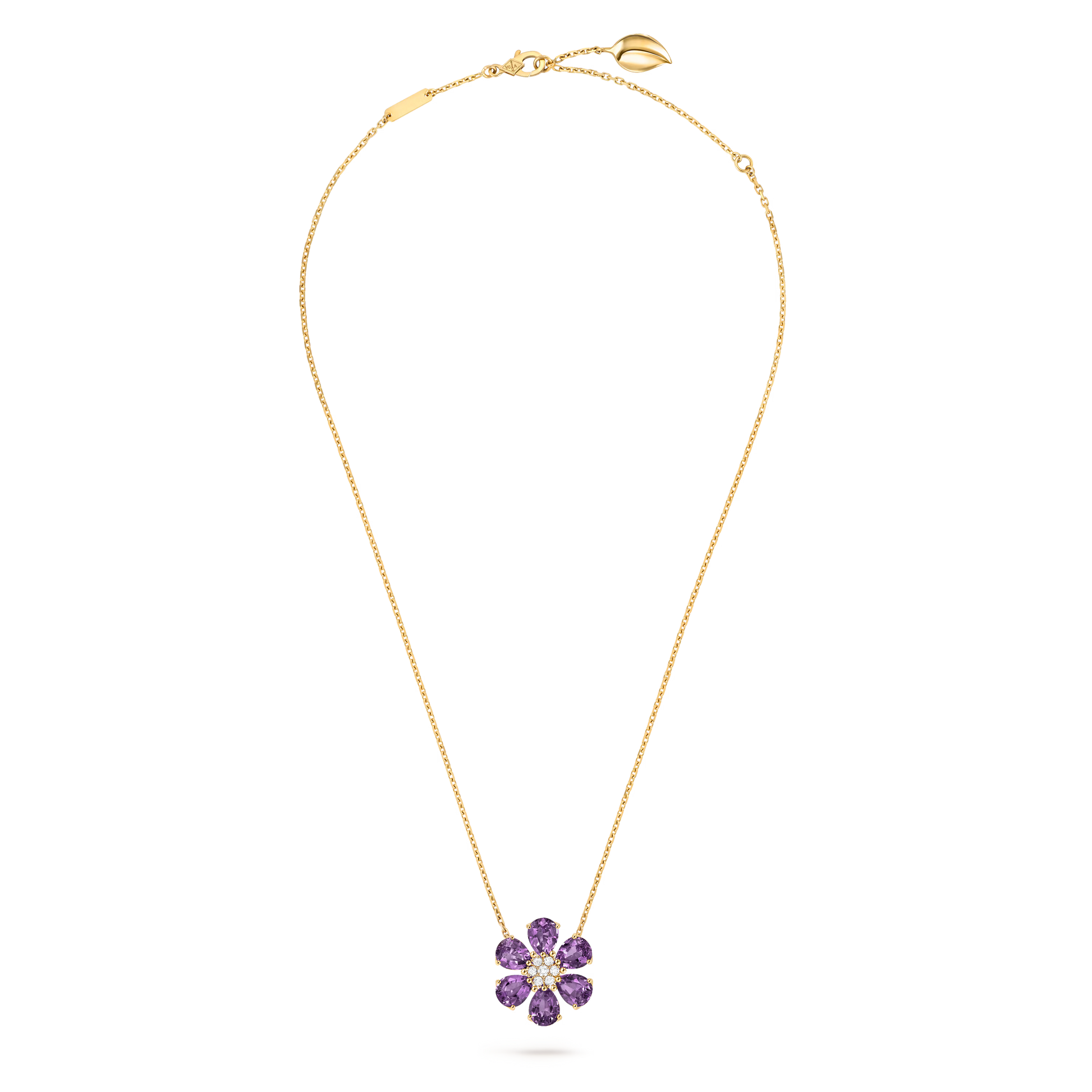 Fleurs d’Hawaï pendant, medium model, 18K yellow gold, amethysts, round diamonds.