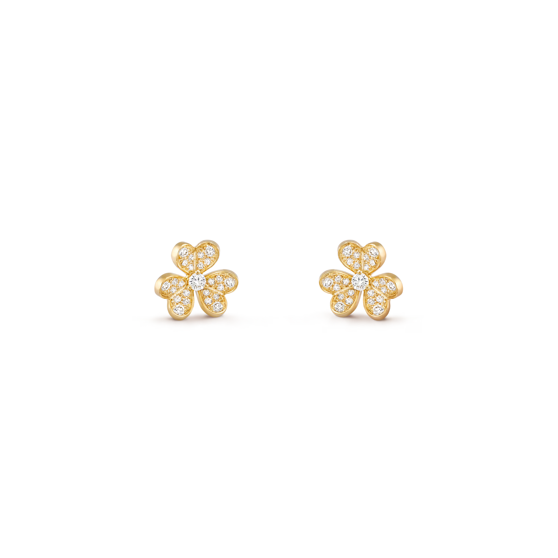 Frivole mini earrings crafted from 18K yellow gold, their delicate design is set with brilliant round diamonds that catch the light with every movement. Perfect for adding a subtle yet charming shimmer to any outfit.