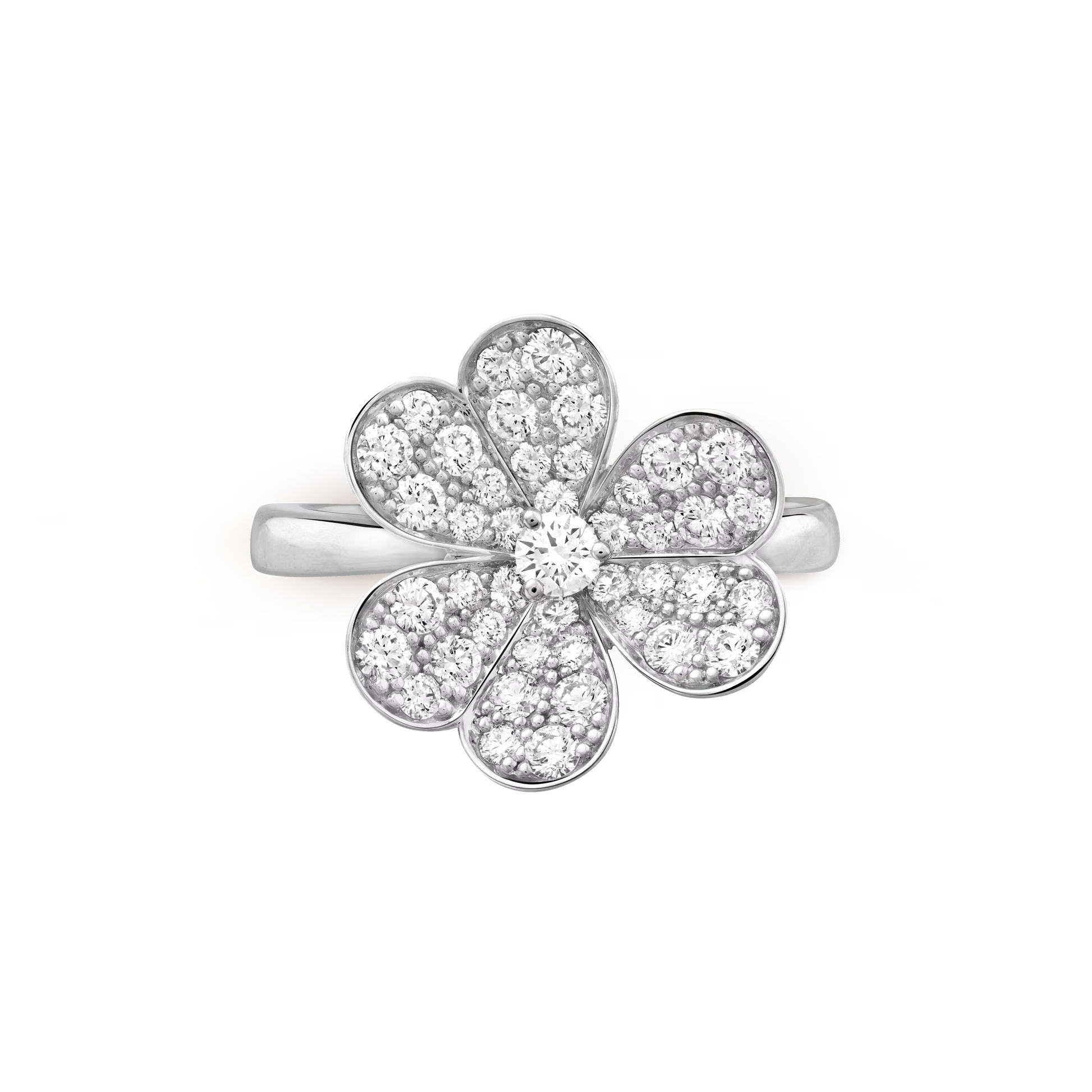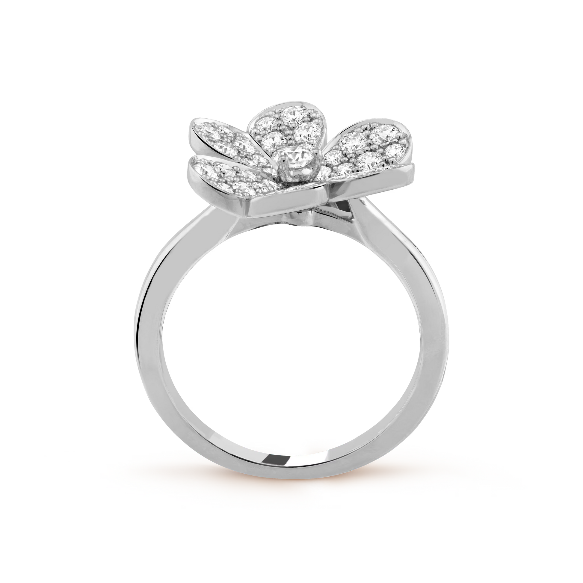 a single delicate flower ring crafted in rhodium-plated 18K white gold. Sparkling round diamonds bring a playful sparkle, making this ring the perfect.