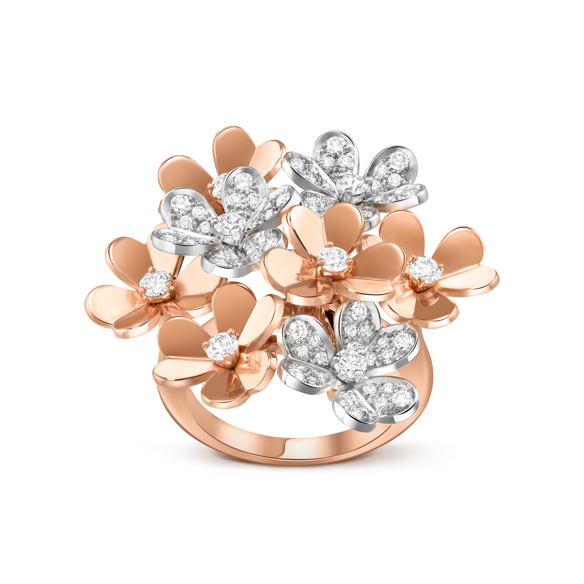 Frivole ring, 8 flowers, 18K rose gold, rhodium-plated 18K white gold, round diamonds.