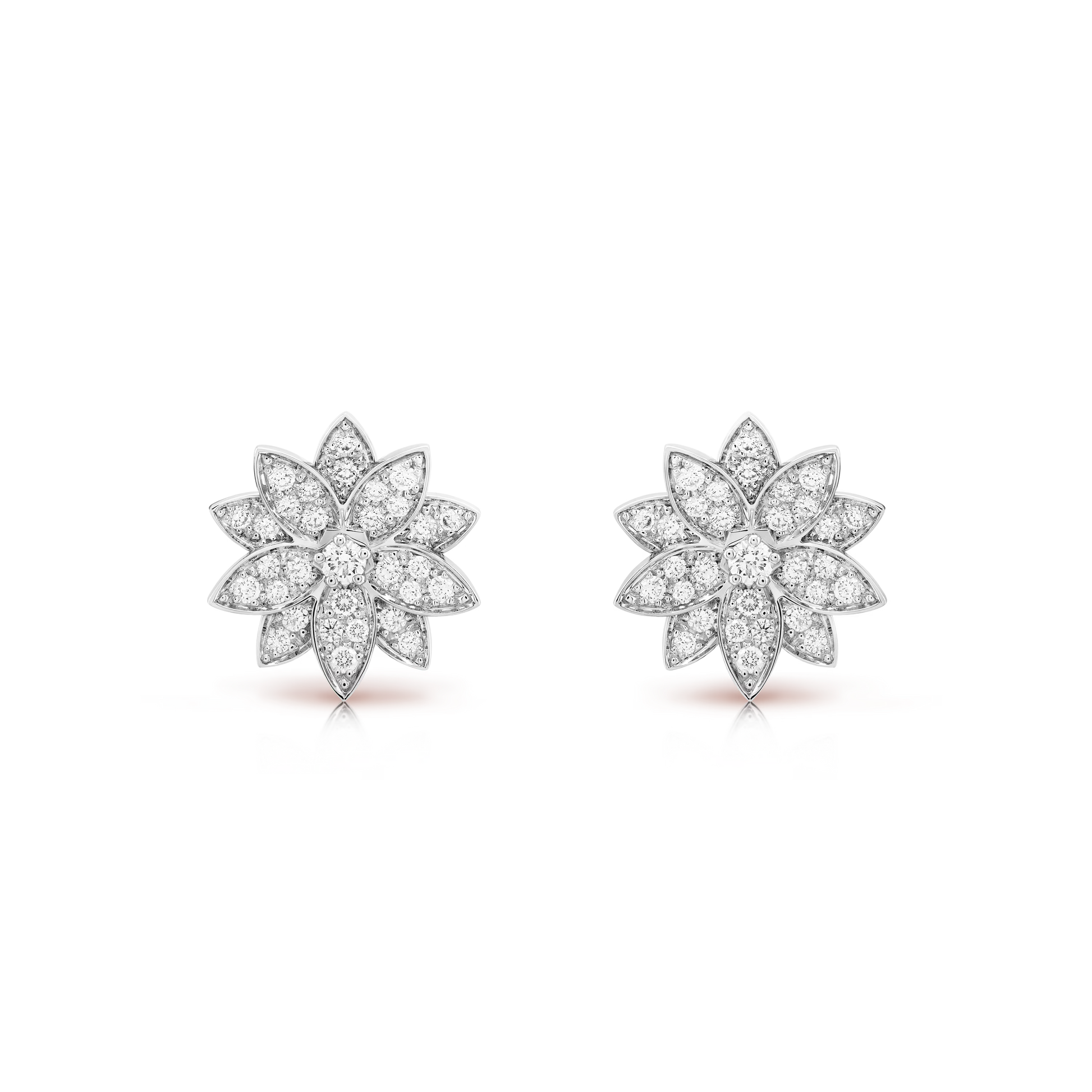 Lotus earrings, small model, rhodium plated 18K white gold, round diamonds.