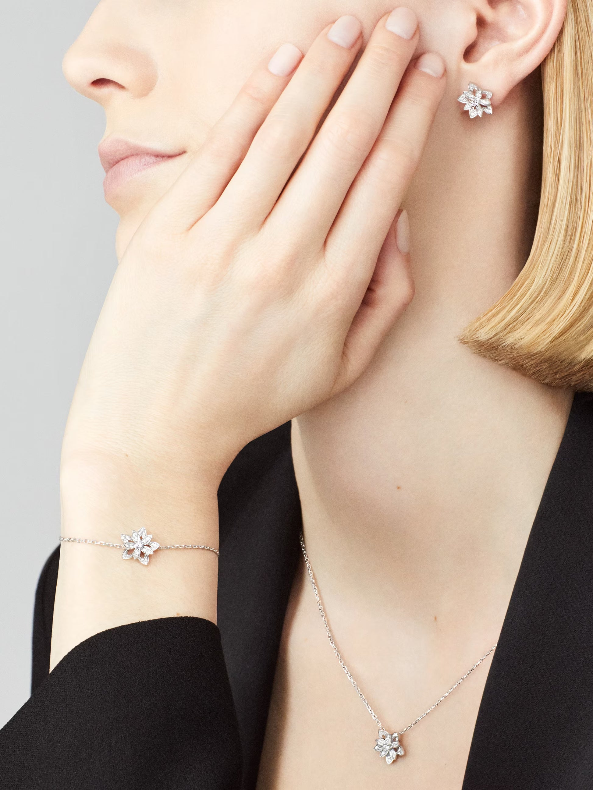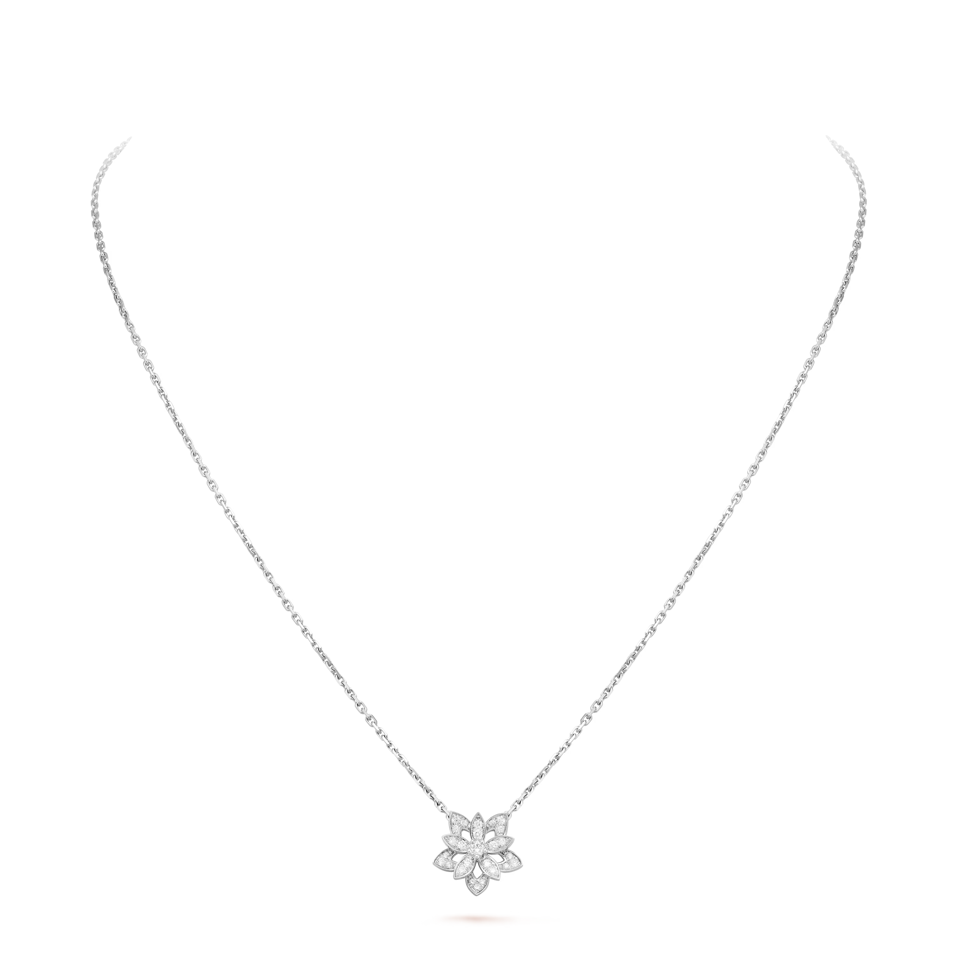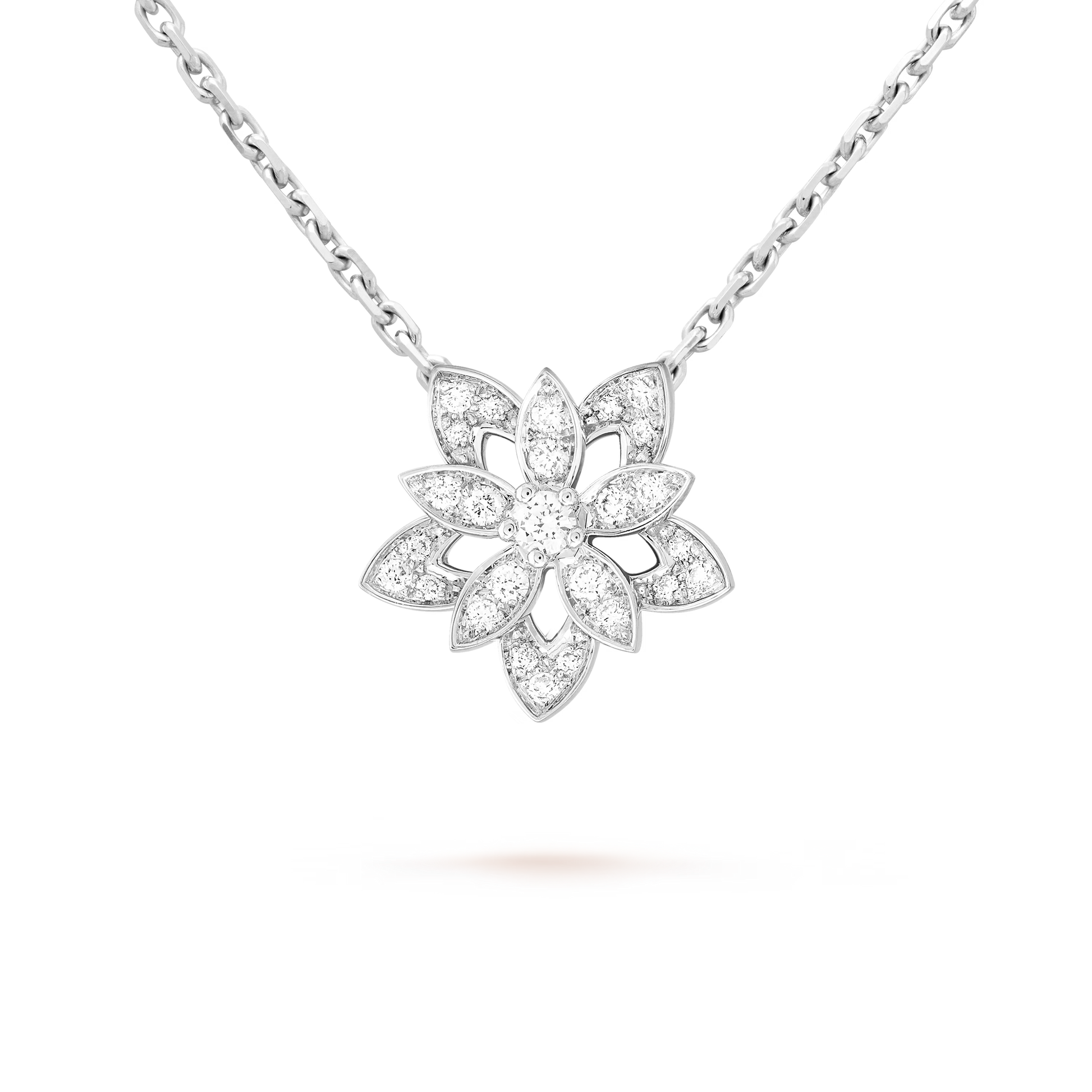 Lotus openwork pendant, mini model, rhodium plated 18K white gold, round diamonds.