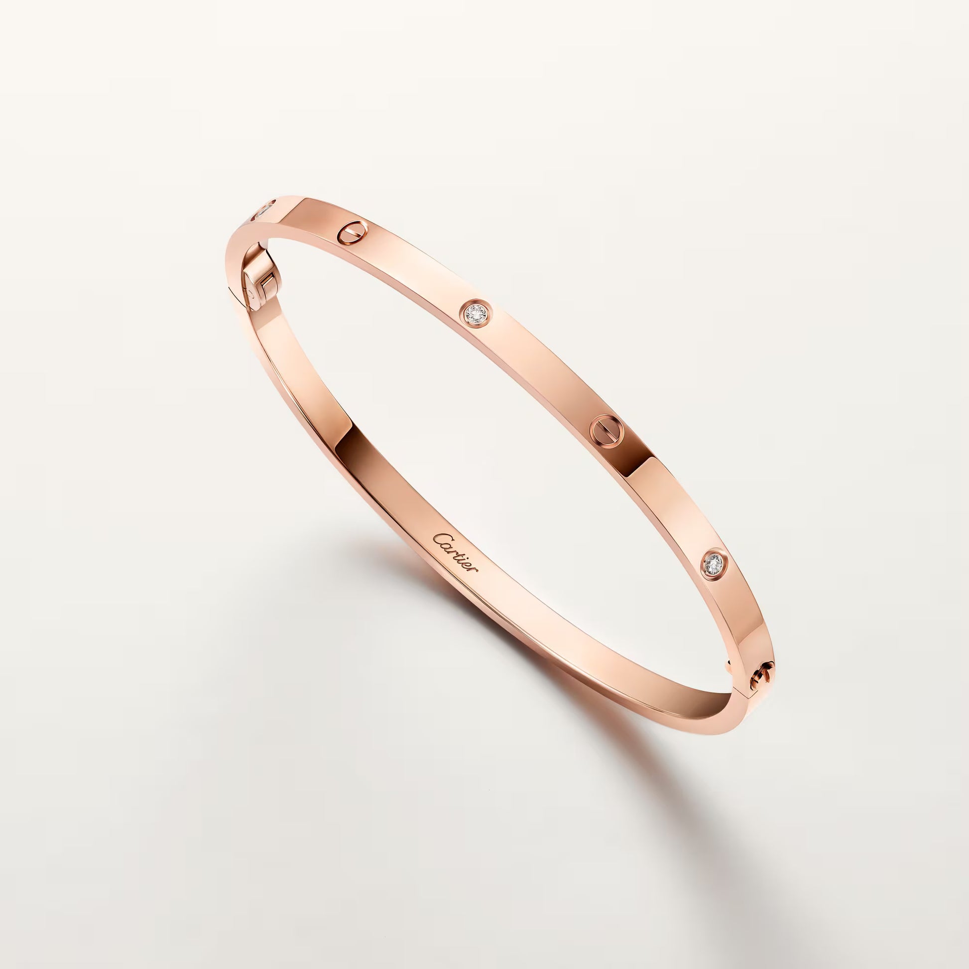 Elevate your elegance with this small model LOVE bracelet crafted in luxurious 18K rose gold. Featuring six exquisitely set diamonds, it offers a delicate yet striking accent to any outfit.