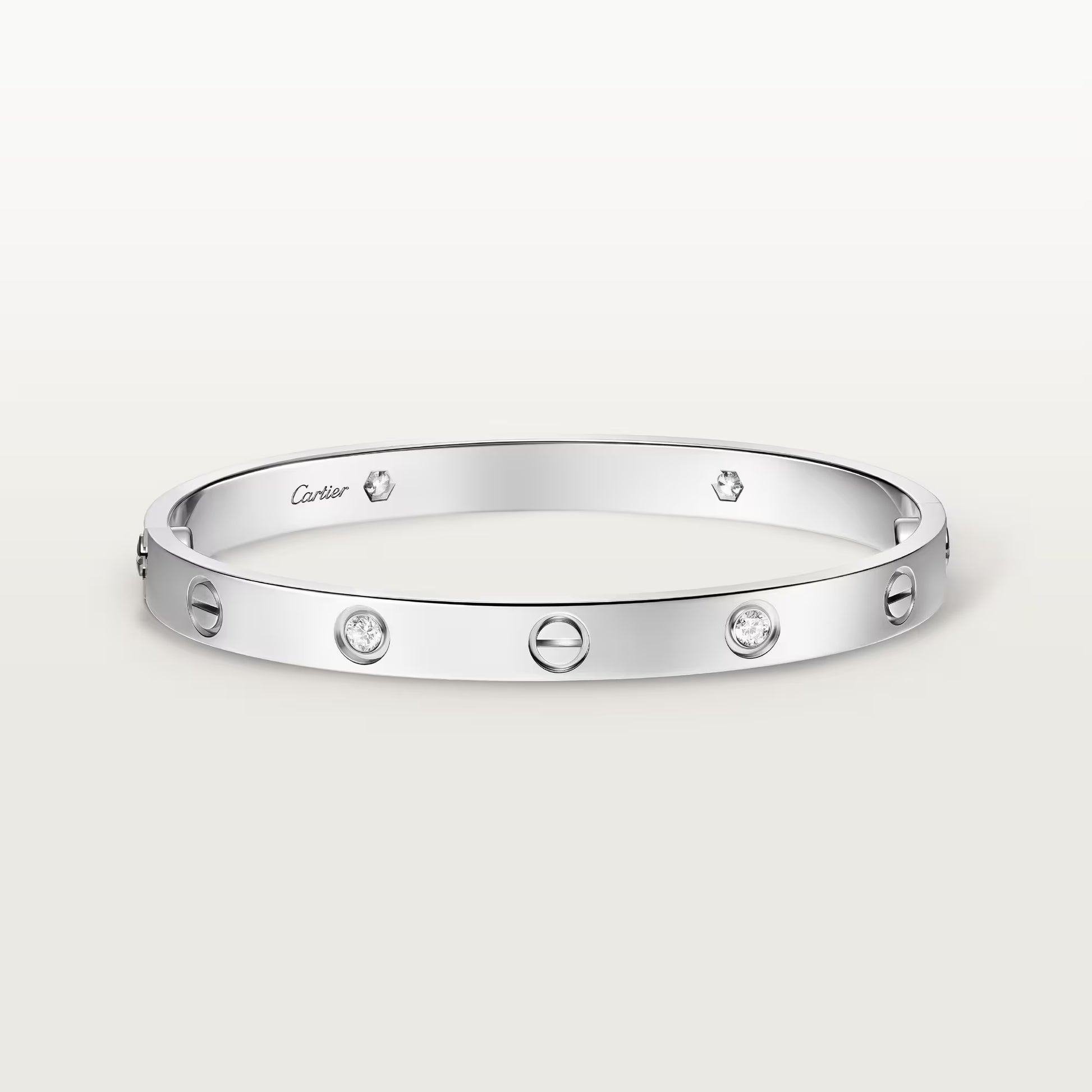This classic LOVE bracelet in 18K white gold features four expertly set diamonds, combining refined craftsmanship with timeless elegance.