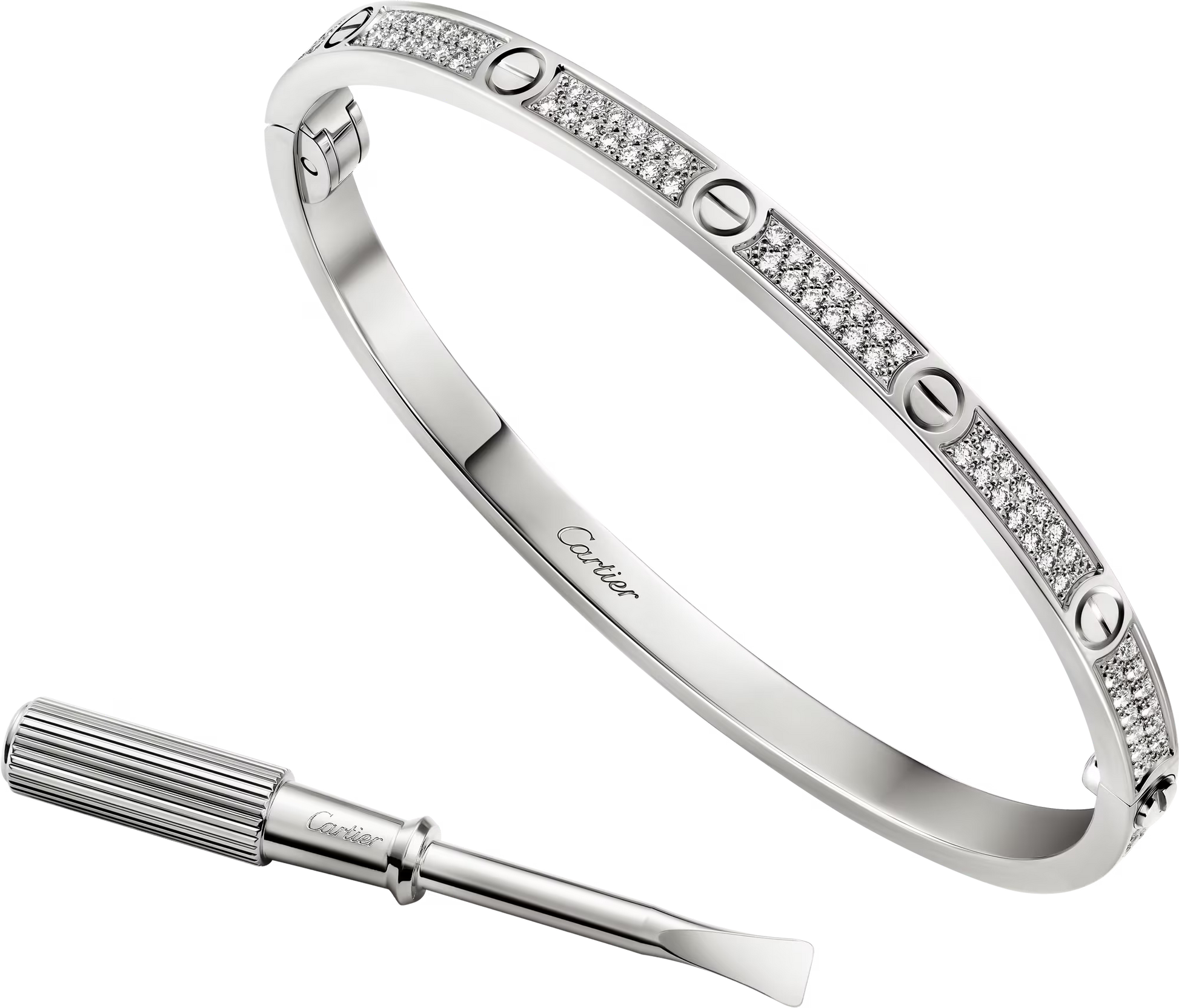 This small model LOVE bracelet, crafted in 18K white gold, features a refined pavé setting that enhances its elegant shine. Its delicate design offers a timeless symbol of affection, perfect for daily wear or special occasions.