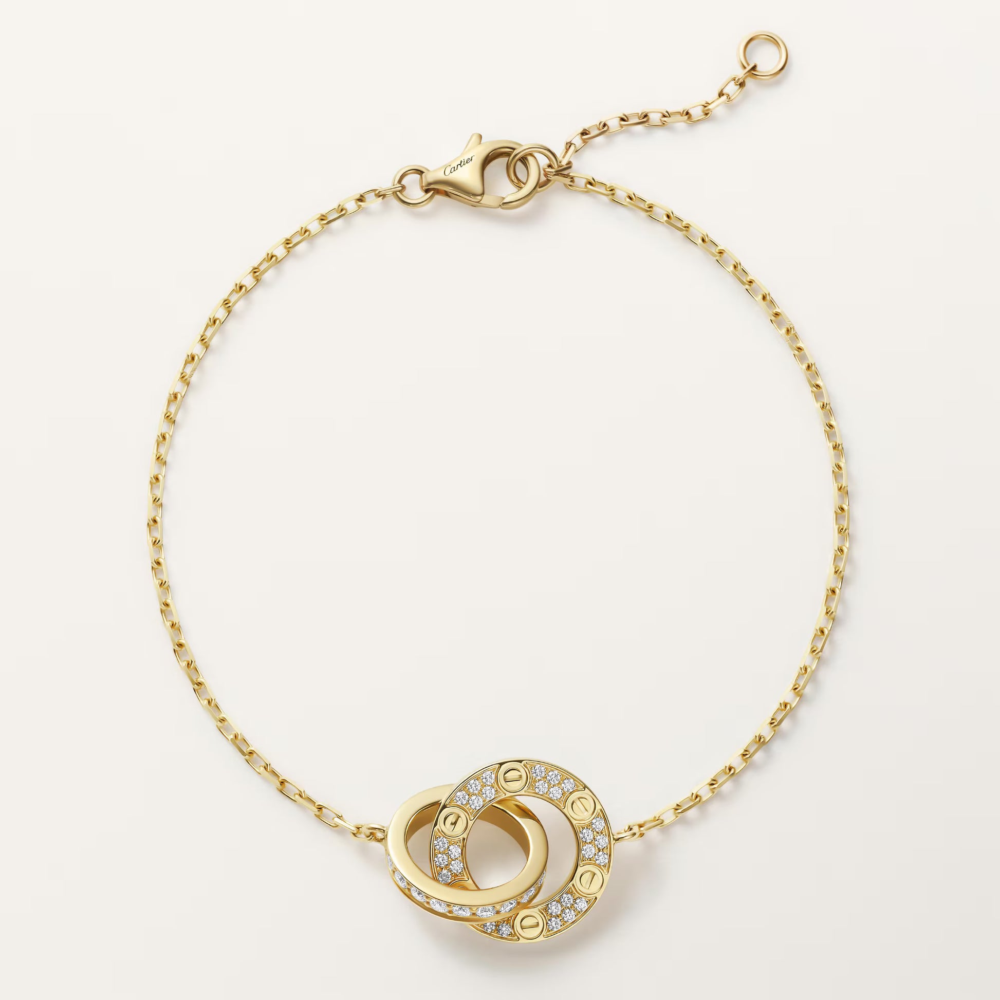 Crafted in 18K yellow gold, this LOVE bracelet features a delicate chain design elegantly paved with shimmering stones. Its refined craftsmanship offers a timeless accessory that complements both everyday wear and special occasions, adding a subtle touch of luxury to your collection.