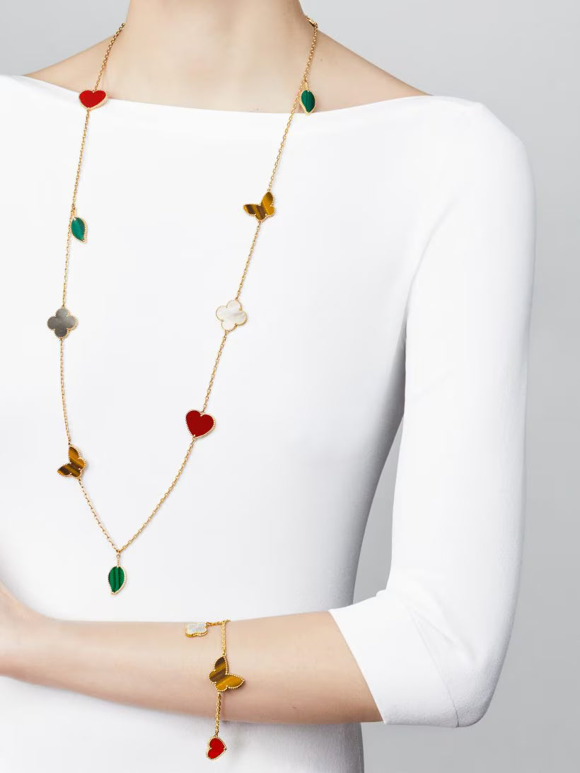 Crafted in 18K yellow gold, this Lucky Alhambra long necklace features twelve playful motifs in carnelian, tiger’s eye, white and gray mother-of-pearl, and malachite, symbolizing joy and good fortune.