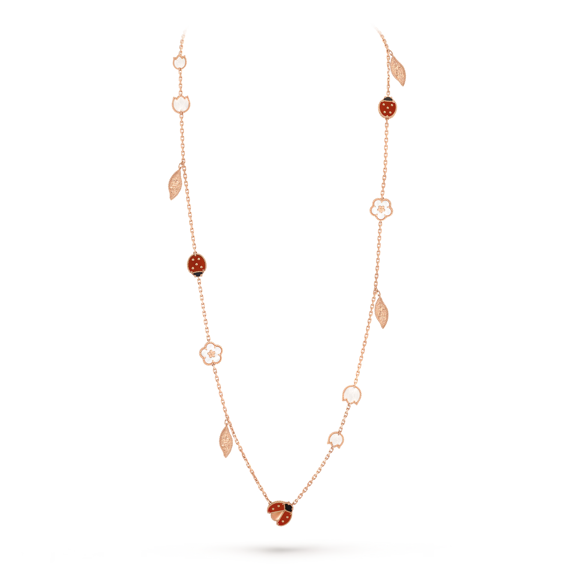 Lucky Spring long necklace features 15 expertly crafted motifs in 18K rose gold, adorned with white mother-of-pearl, carnelian, and onyx. This sophisticated combination offers a balanced contrast of soft iridescence and vibrant tones.