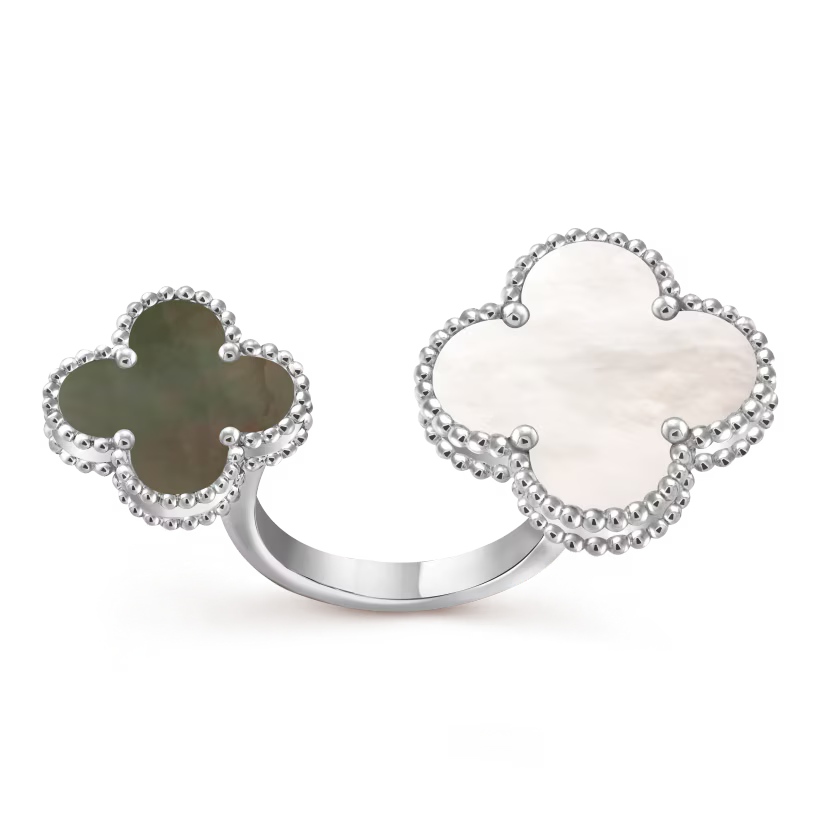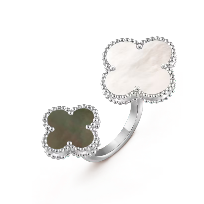 Crafted in rhodium-plated 18K white gold, this Magic Alhambra Between the Finger ring features two clover motifs — one in luminous white mother-of-pearl and the other in soft gray mother-of-pearl — for an elegant and refined contrast.