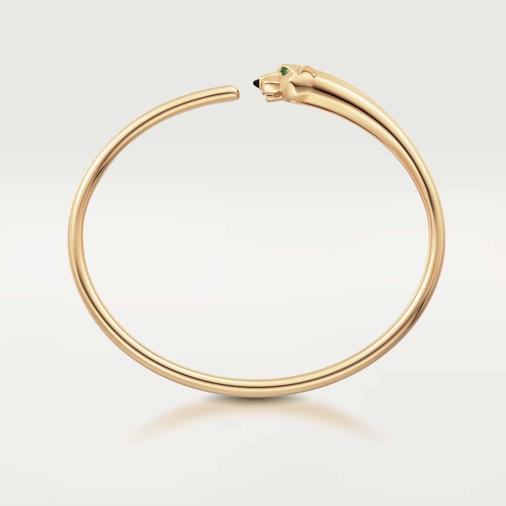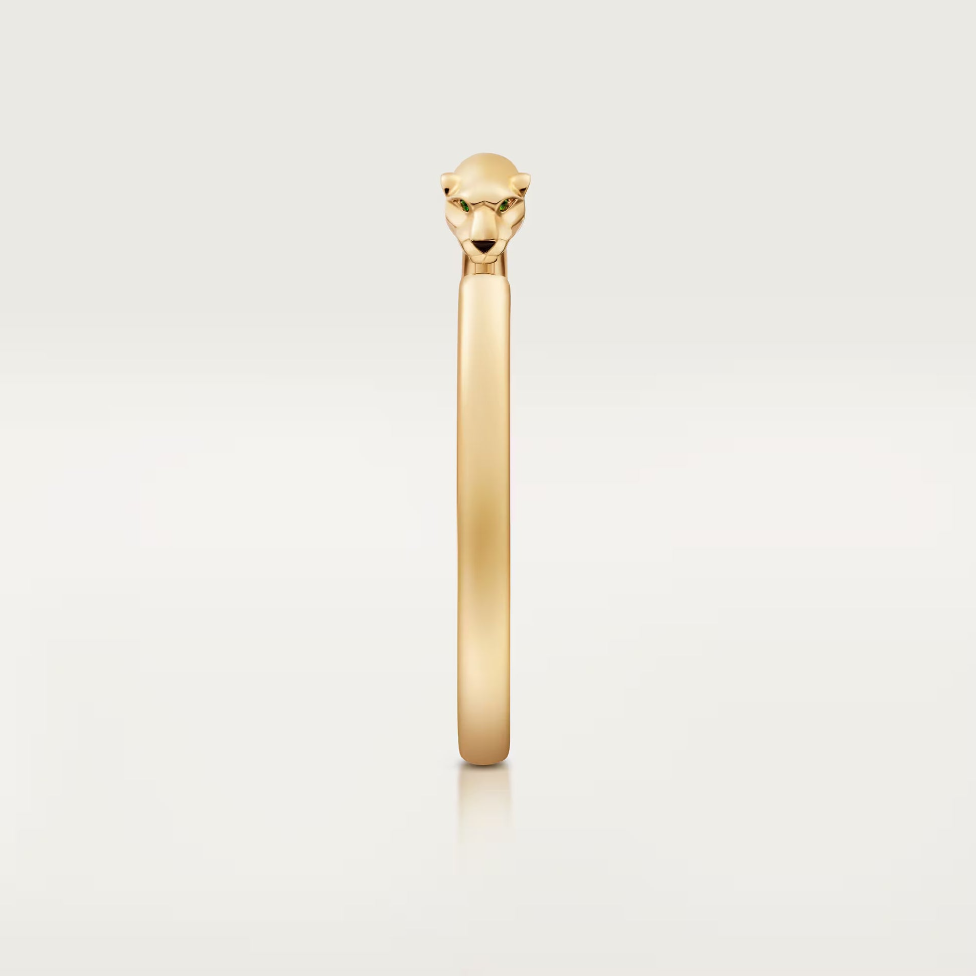 The Panthère de Cartier small model is crafted from luxurious 18K yellow gold, blending timeless elegance with refined craftsmanship. Its compact size makes it a versatile piece, perfect for daily wear or special occasions.