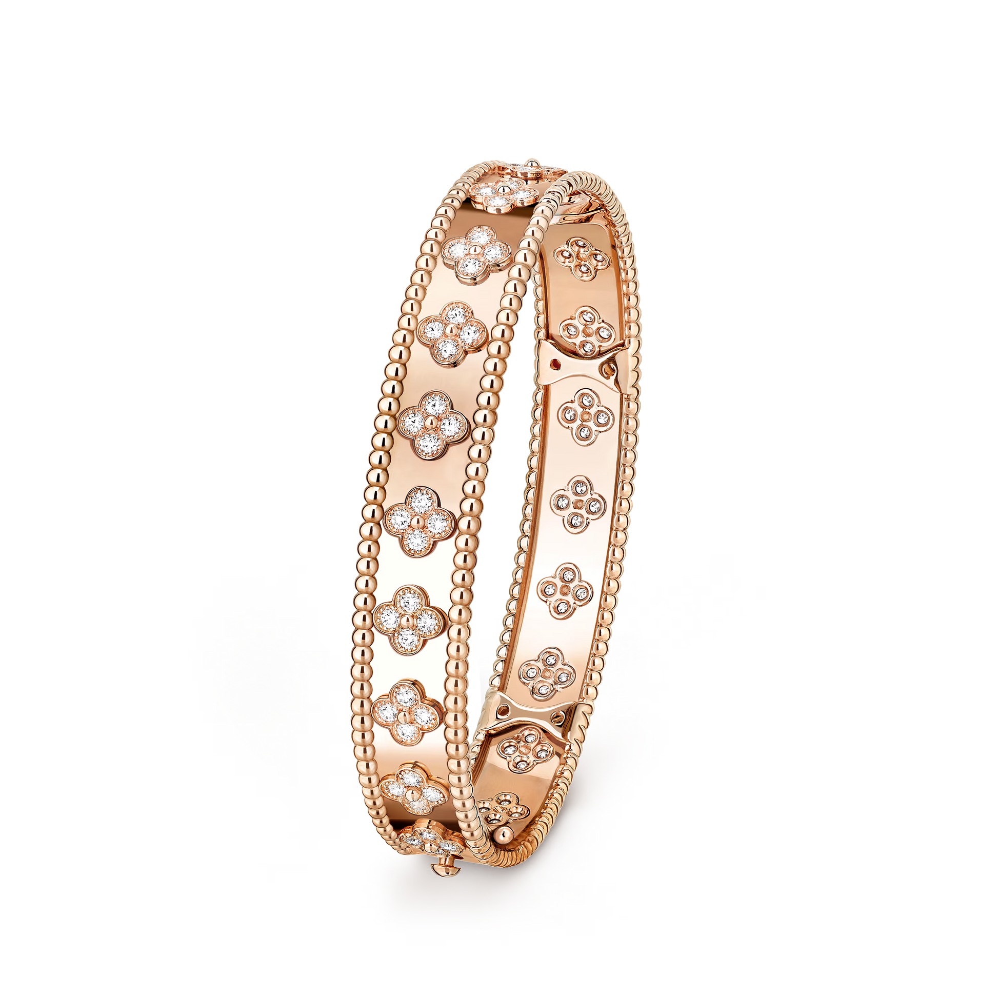 Perlée clovers bracelet in 18K rose gold combines refined craftsmanship with timeless elegance. Featuring delicately shaped clover motifs adorned with sparkling round diamonds.