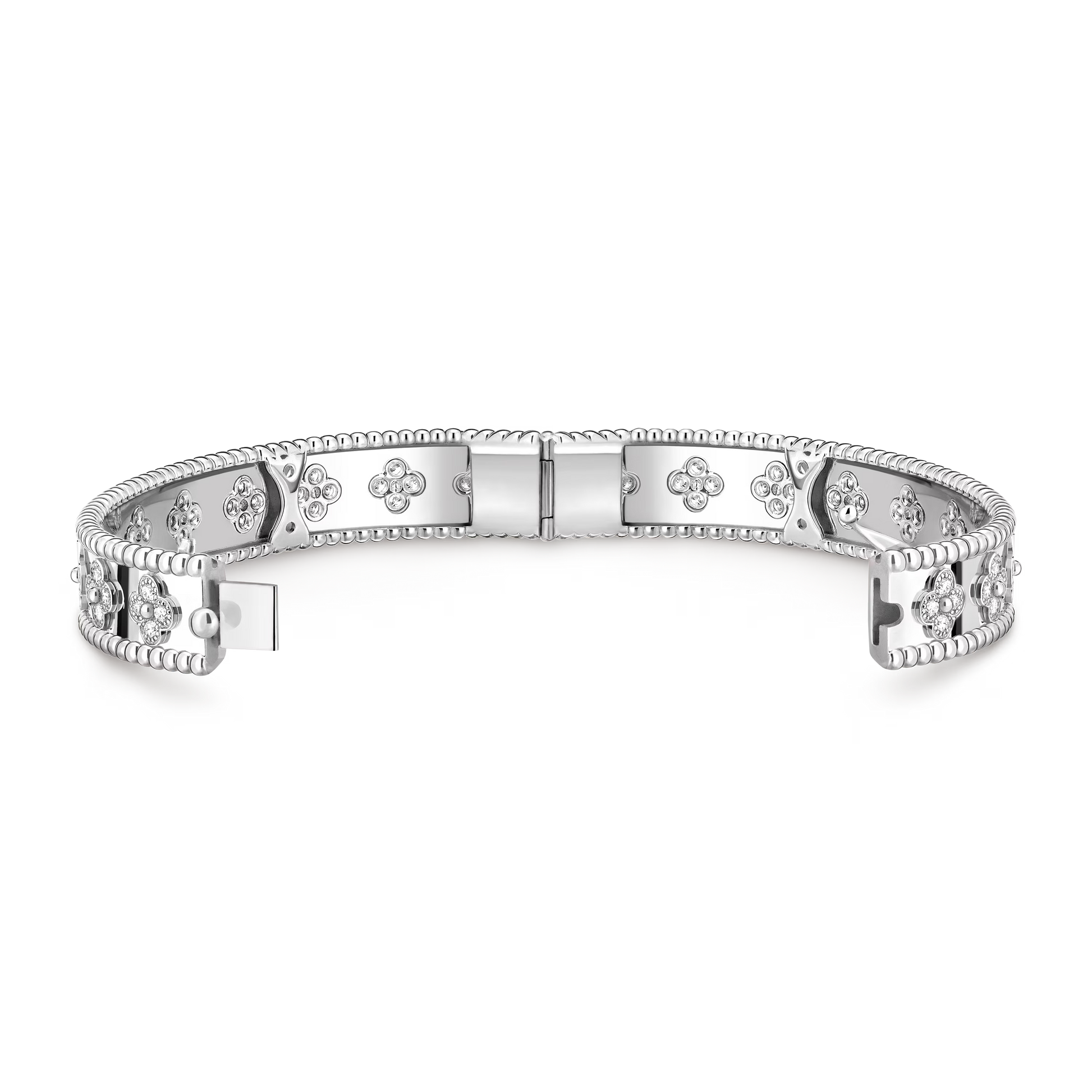 The Perlée Clovers bracelet is a refined accessory crafted from rhodium-plated 18K white gold, designed in a medium size for versatile wear.