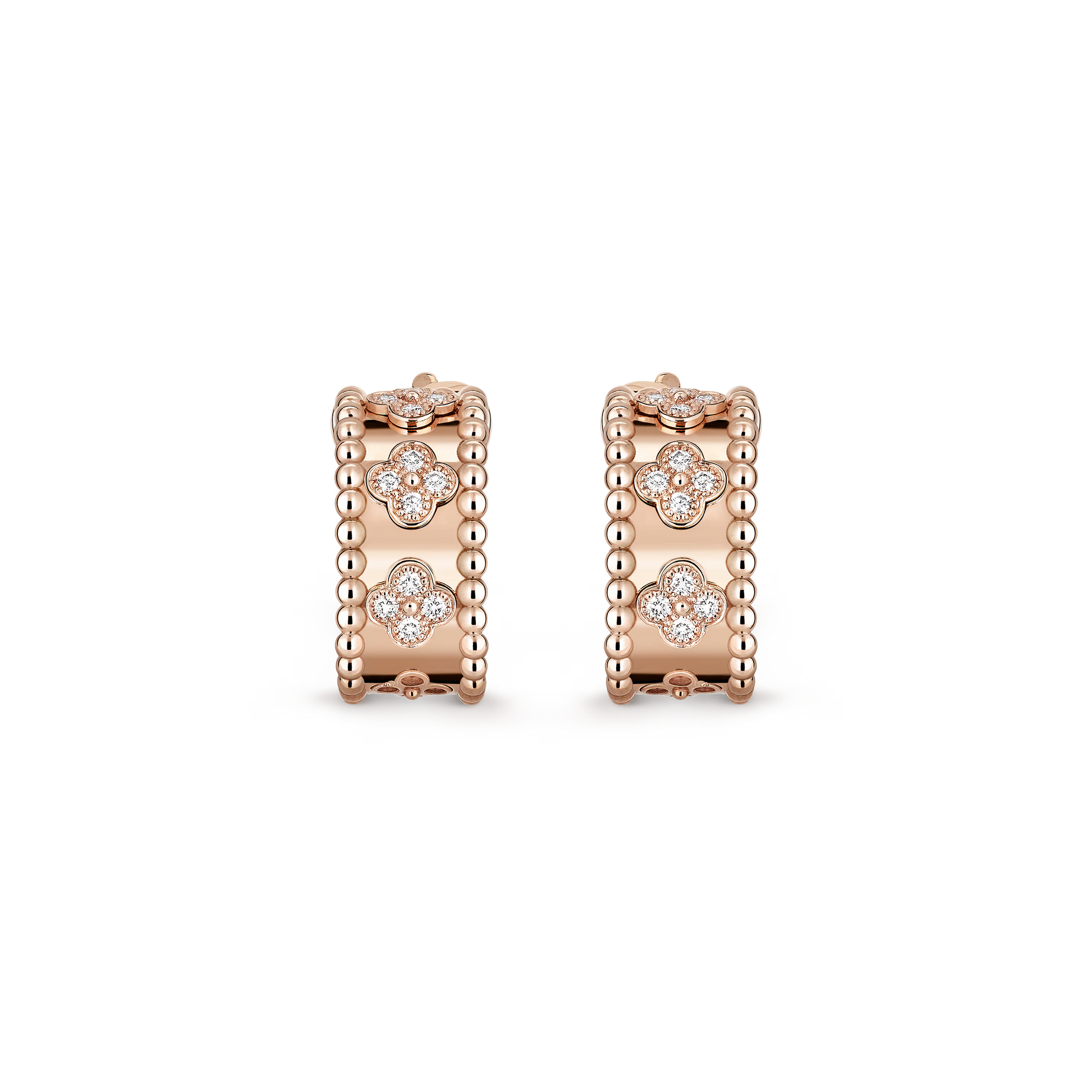 Elevate your style with the Perlée Clovers hoop earrings, crafted in luxurious 18K rose gold. Each earring features delicate clover motifs adorned with meticulously set round diamonds, offering a refined balance of elegance and sparkle.