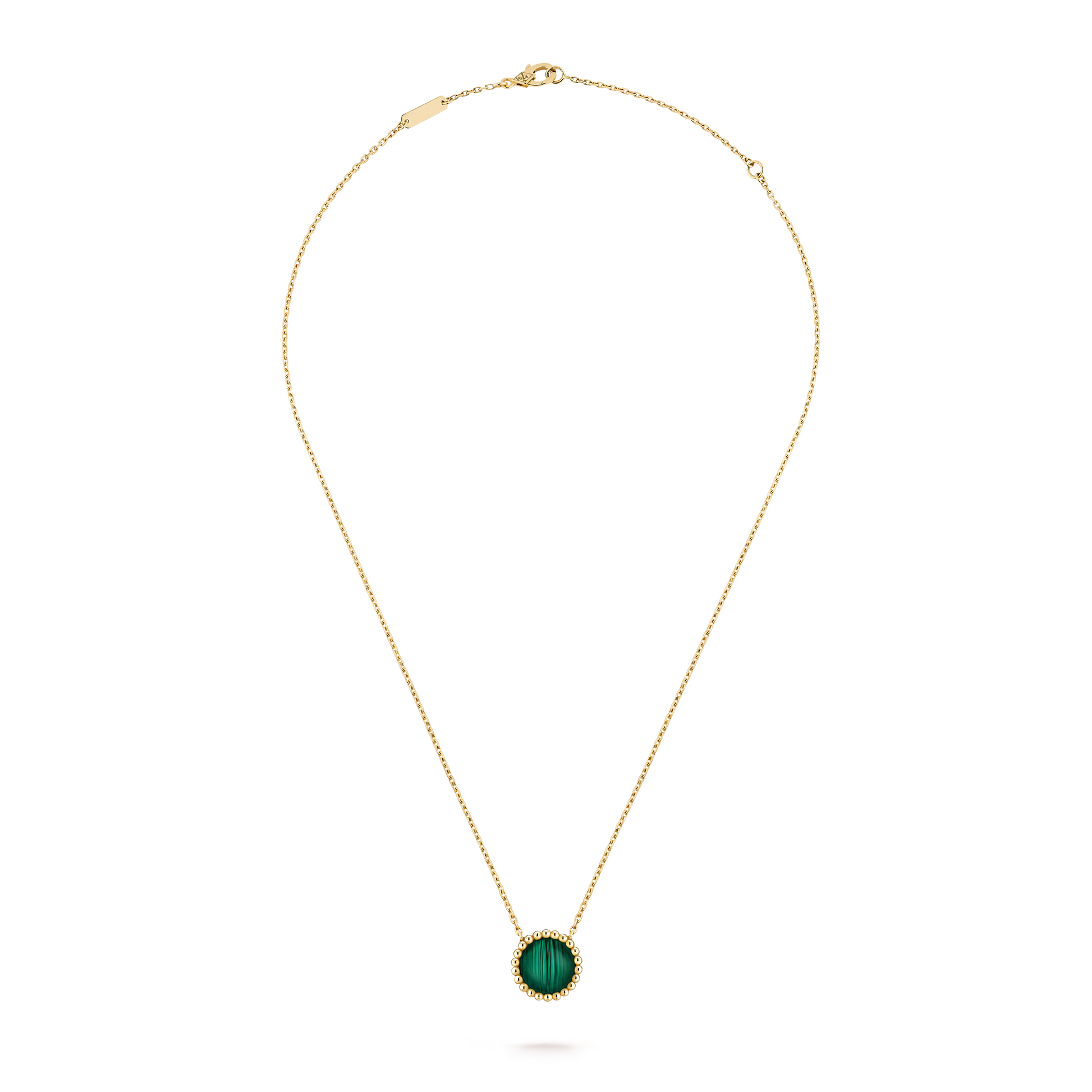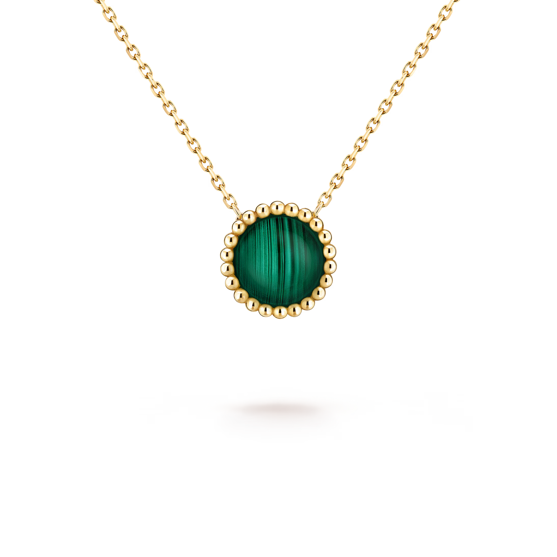 Perlée couleurs pendant is crafted from 18K yellow gold and features a vibrant malachite stone. The pendant is attached to the necklace’s chain,