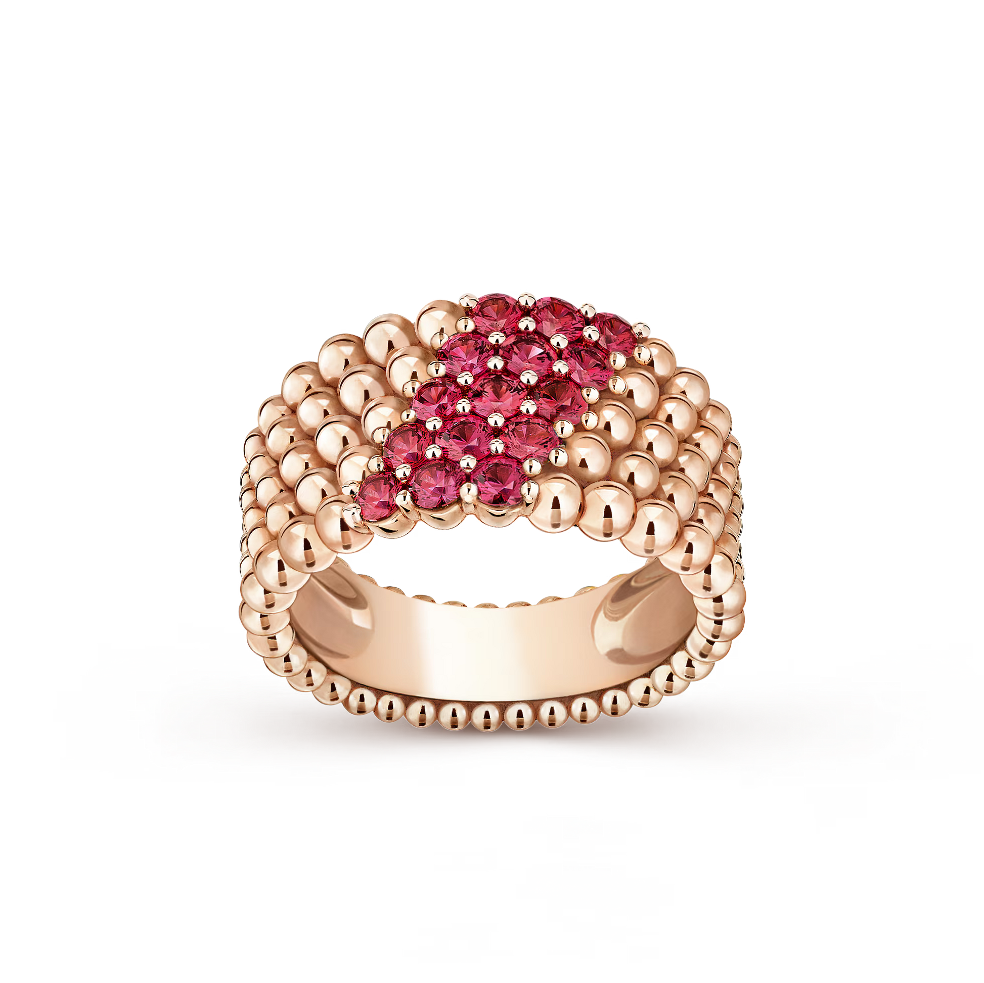 Perlée couleurs ring features five meticulously arranged rows of round rubies set in luxurious 18K rose gold. This expertly crafted piece combines the deep, rich red of the rubies with the warm sheen of rose gold.