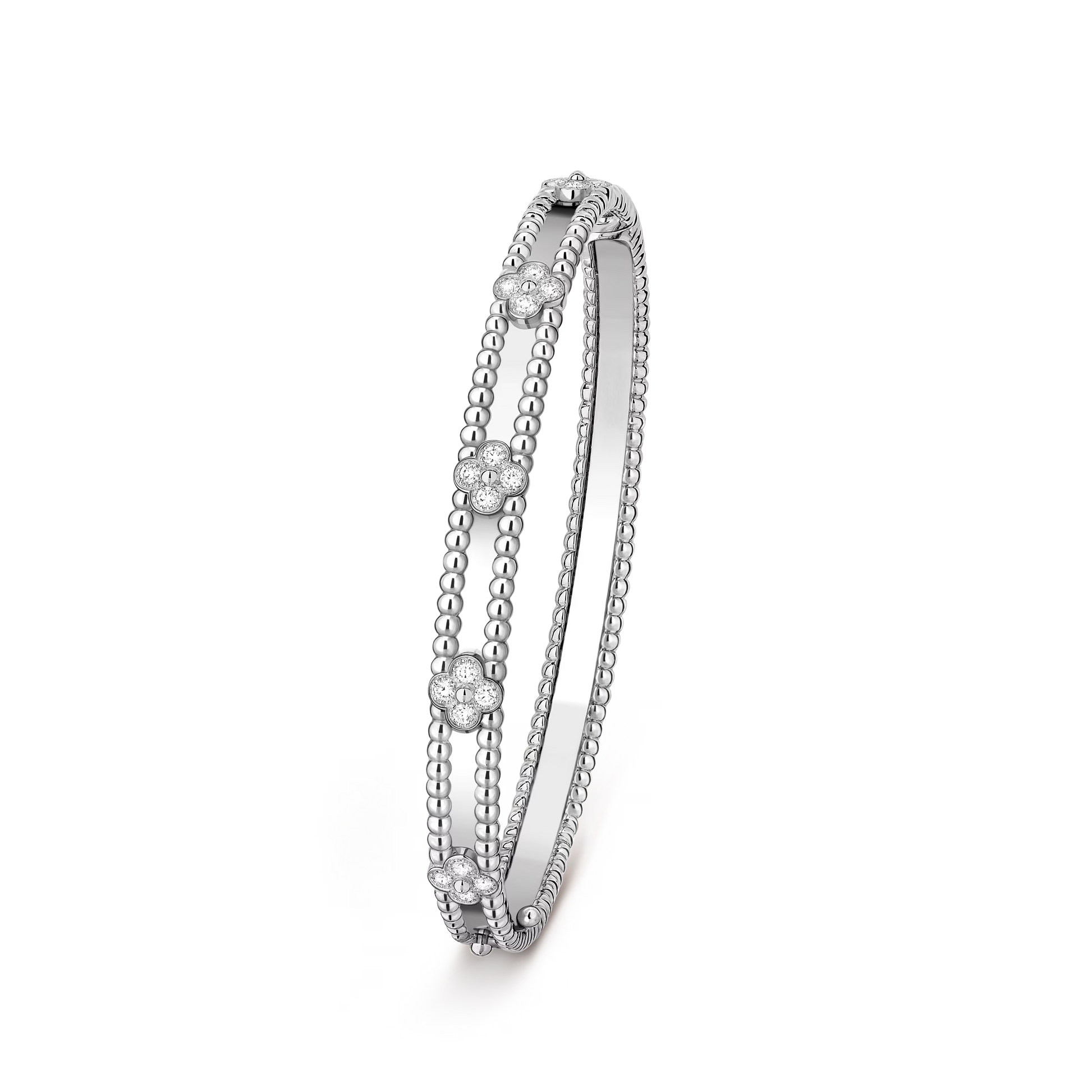 Perlée Sweet Clovers bracelet showcases refined craftsmanship in rhodium-plated 18K white gold. This medium-sized bracelet features intricately designed sweet clover motifs enhanced with carefully set round diamonds.