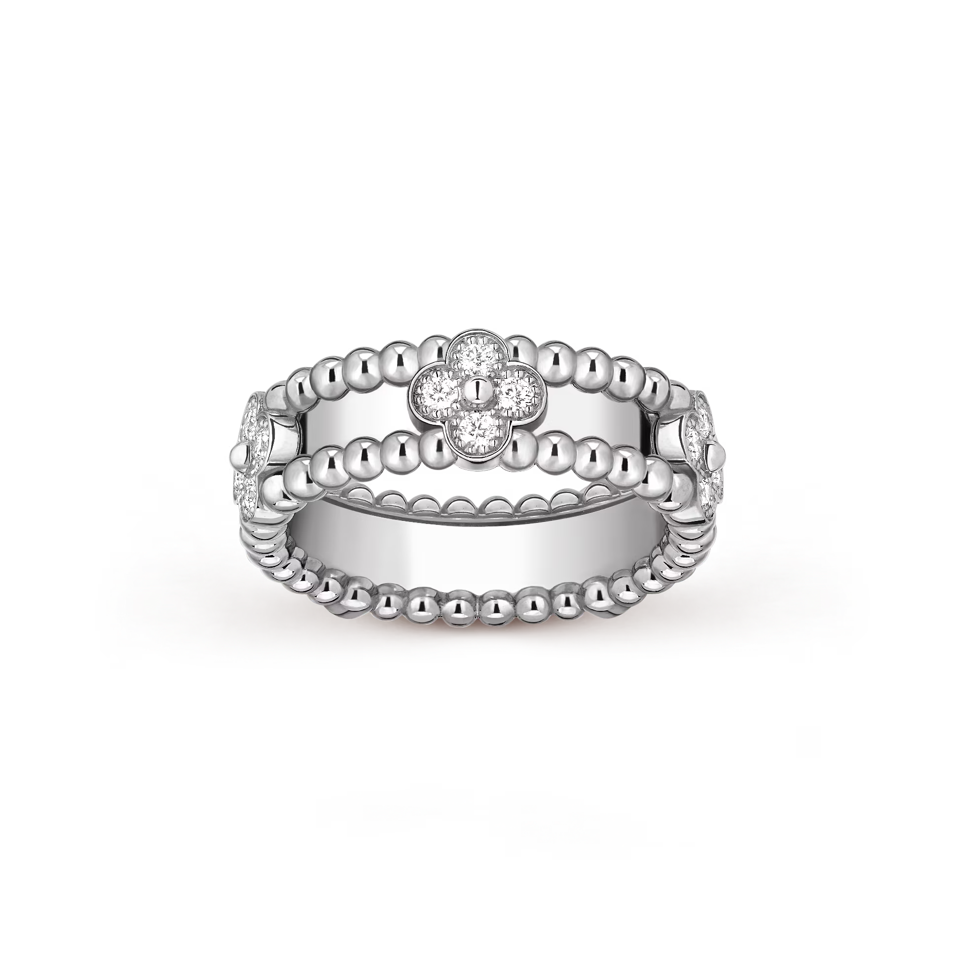 Crafted from rhodium-plated 18K white gold, the Perlée Sweet Clovers ring features delicate round diamonds that enhance its refined elegance.