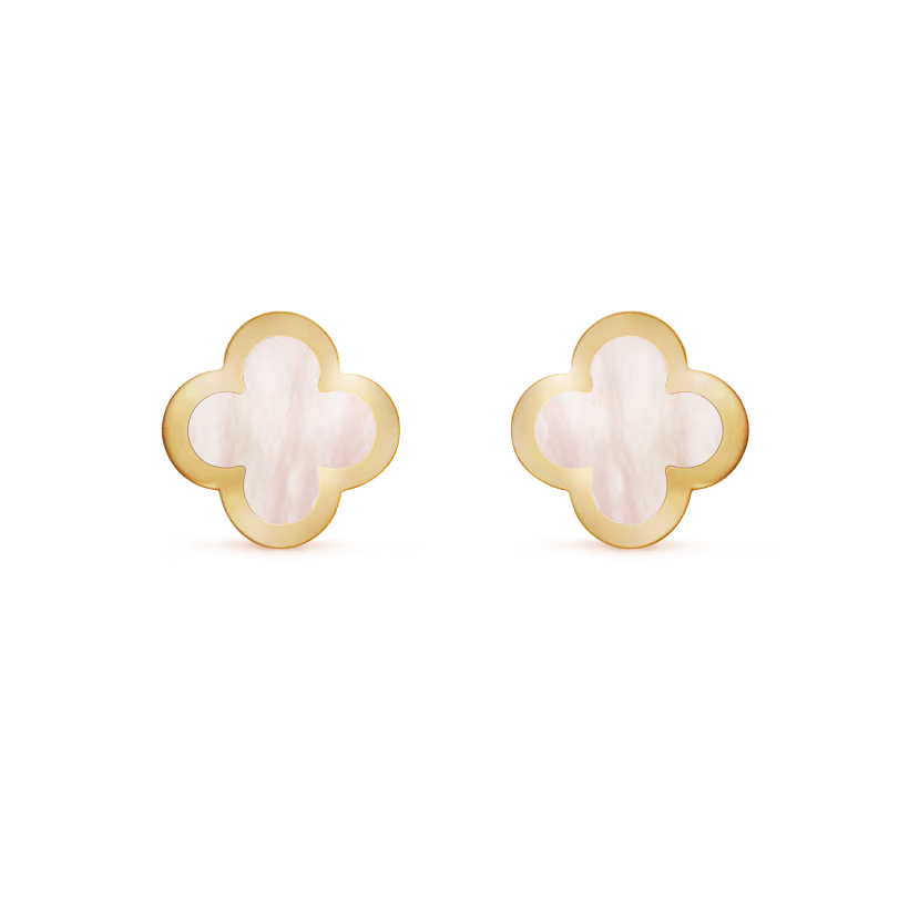 Pure Alhambra earstuds in 18K yellow gold, delicately set with luminous white mother-of-pearl for a refined and timeless elegance. For any questions or concerns, please contact us on WhatsApp.