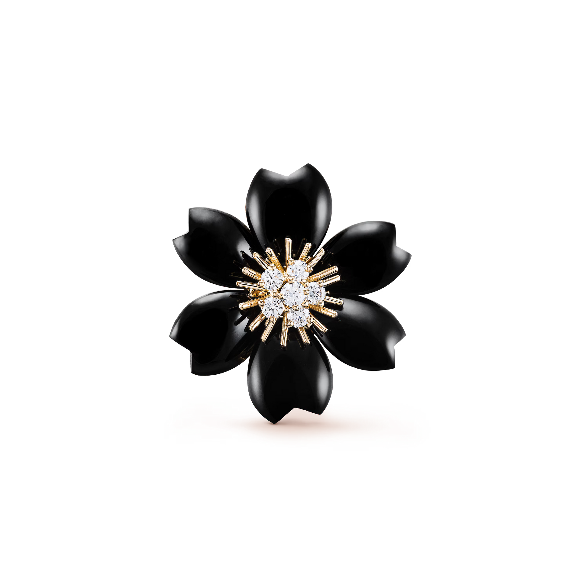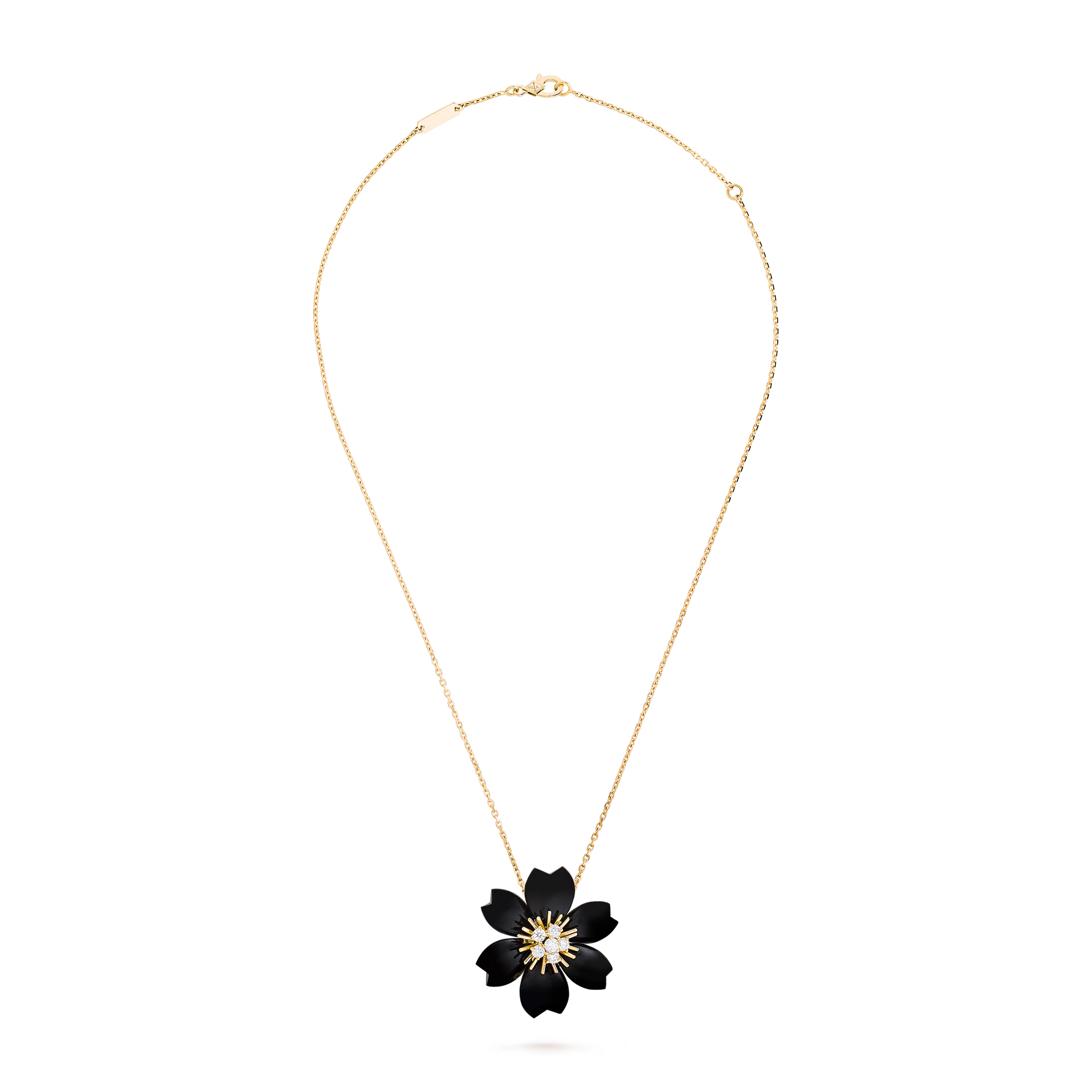 Rose de Noël clip pendant, small model, 18K yellow gold, onyx, round diamonds.