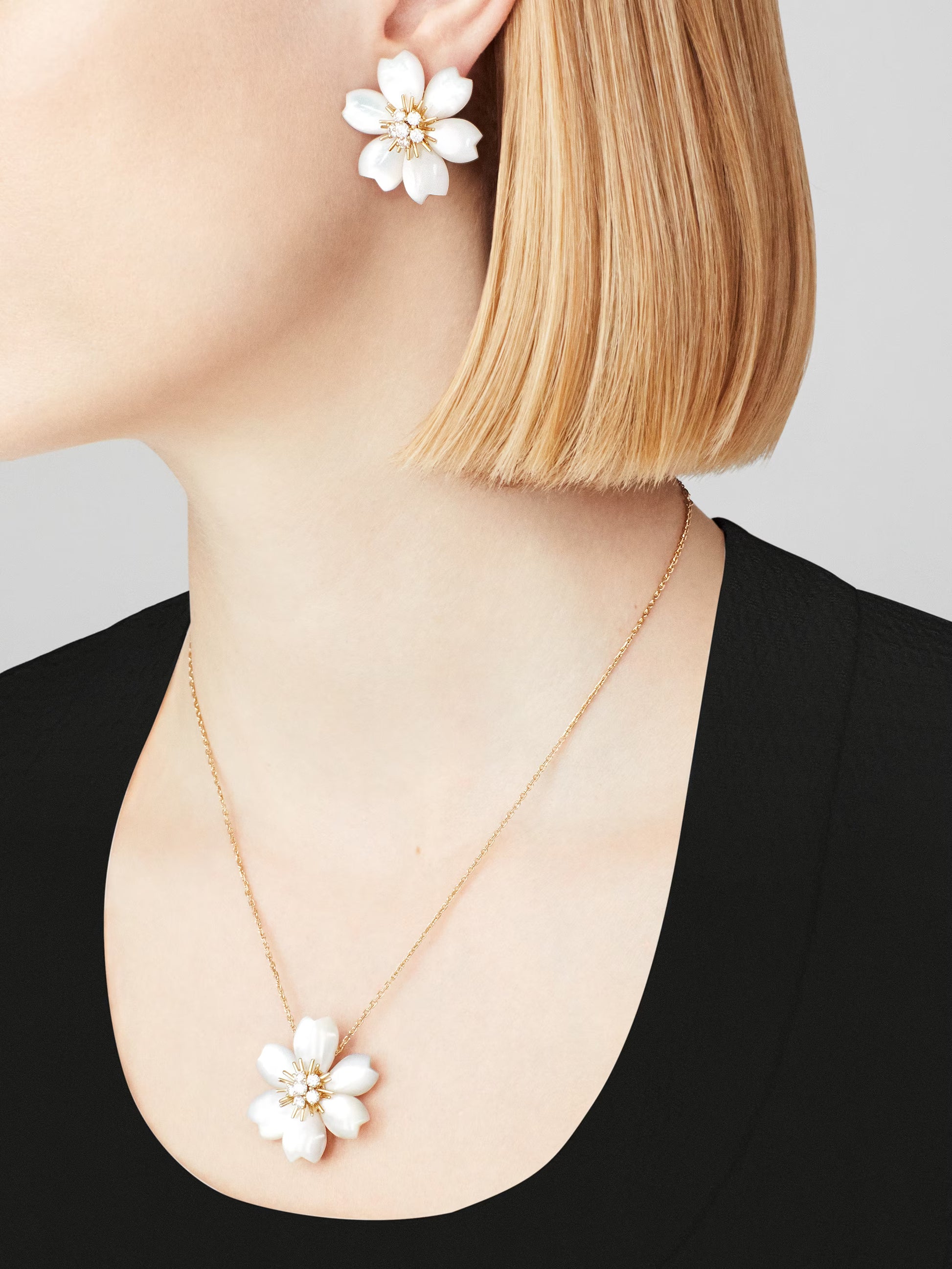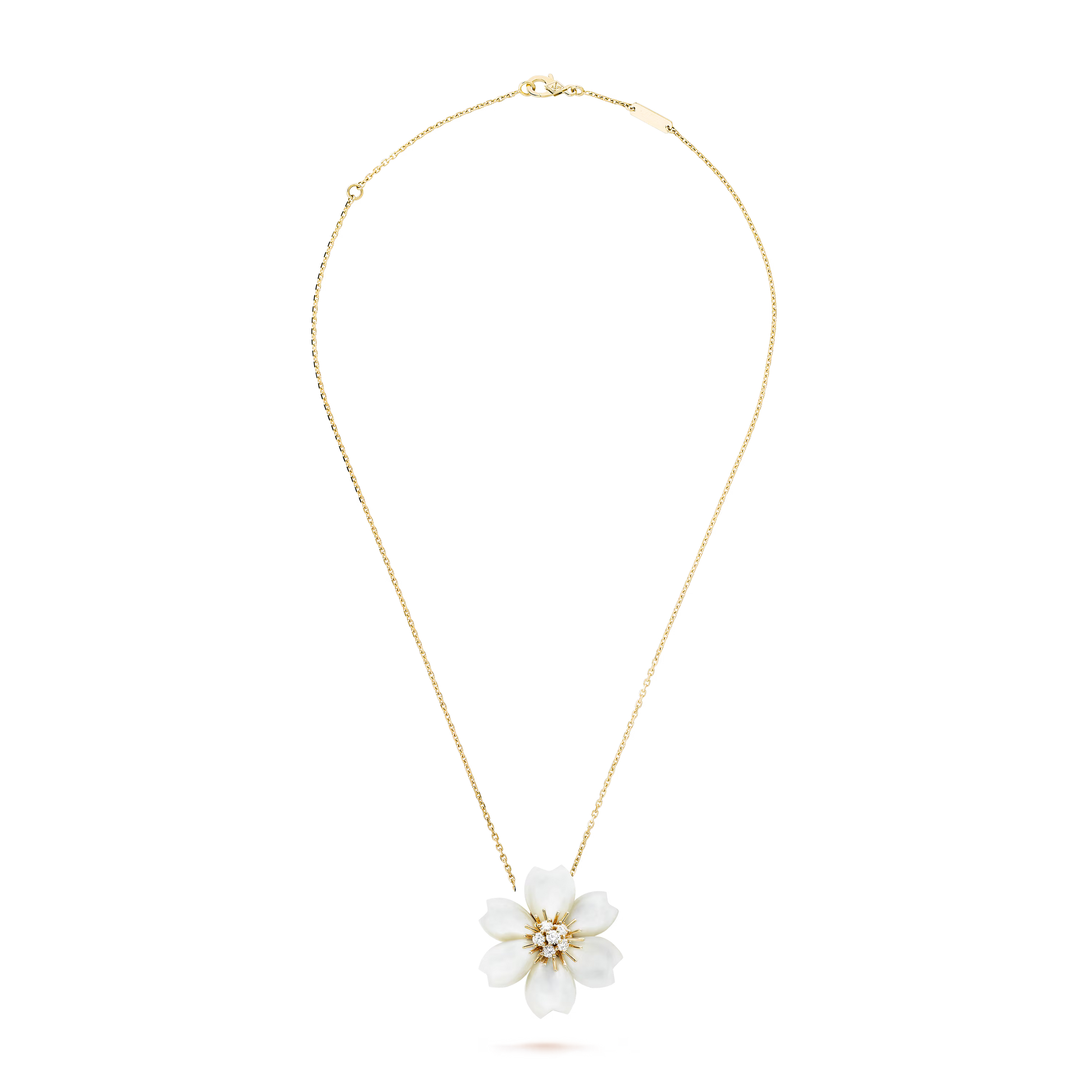 Rose de Noël small clip pendant is a charming treasure crafted from warm 18K yellow gold and shimmering white mother-of-pearl. Sparkling round diamonds add a playful sparkle, making it the perfect little bloom to brighten up your jewelry collection with a touch of fun and elegance.
