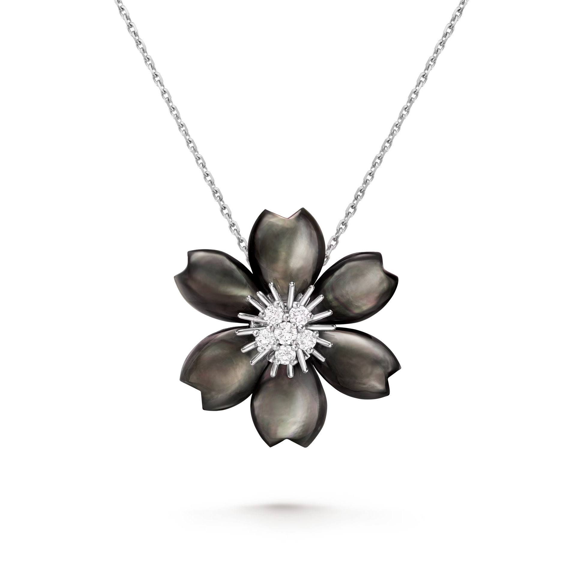 Rose de Noël clip pendant, small model, rhodium plated 18K white gold, gray mother-of-pearl, round diamonds.