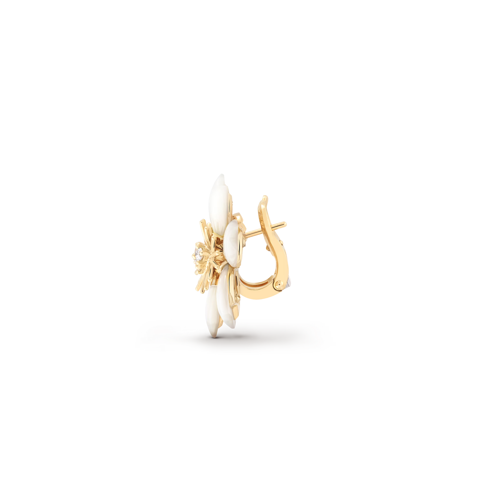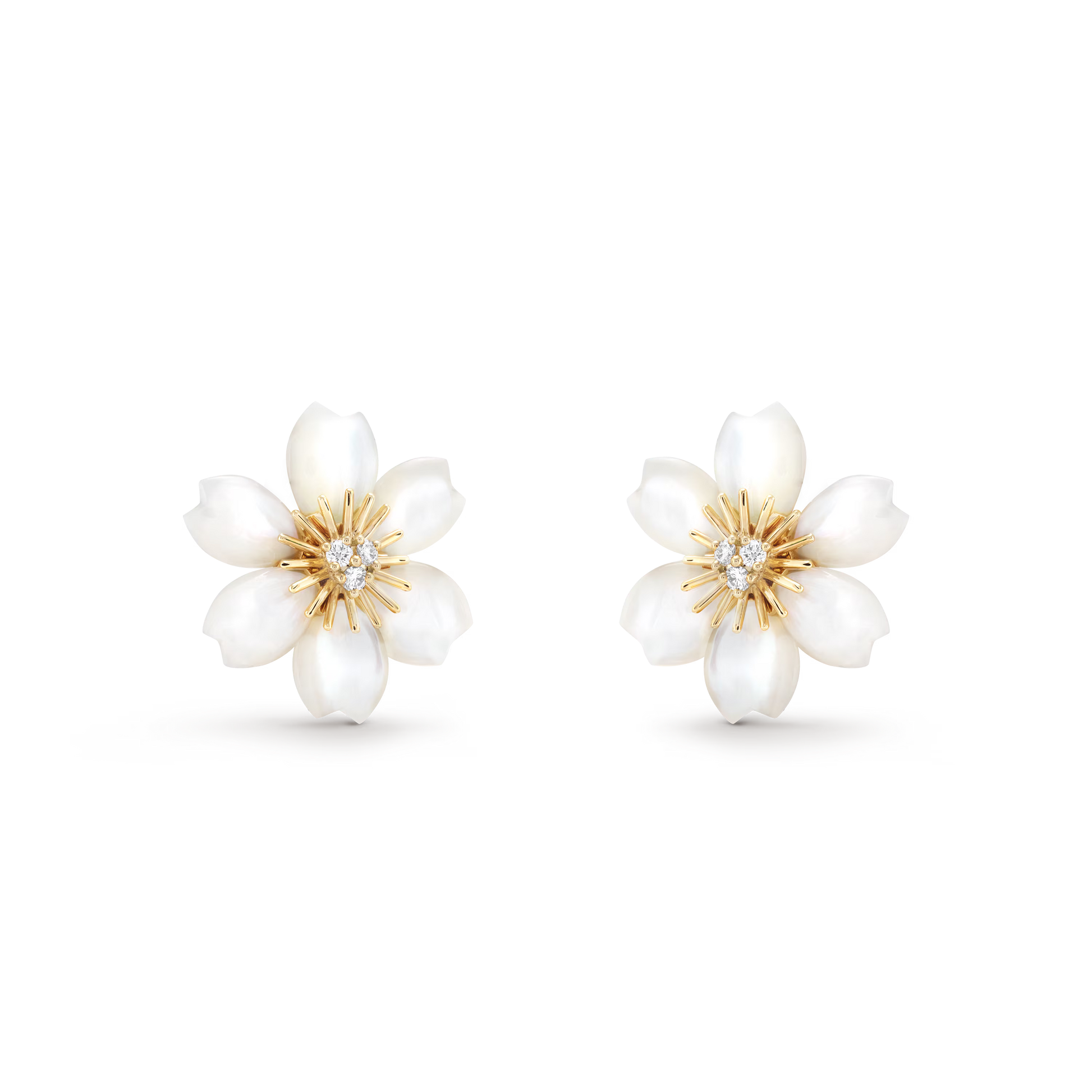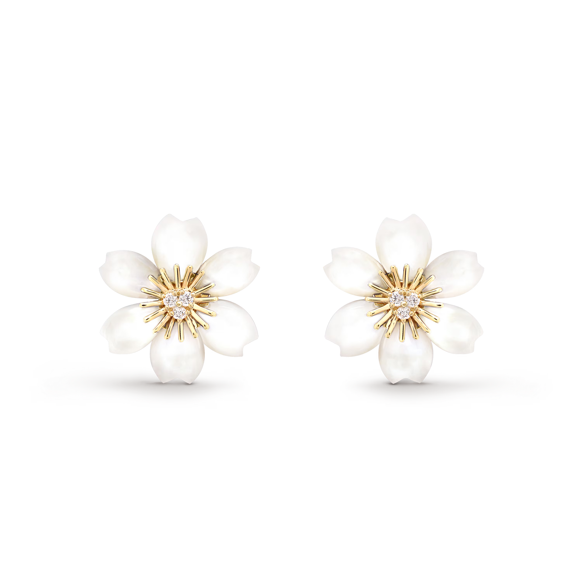 Crafted in radiant 18K yellow gold, they sparkle with delicate round diamonds and glow with the soft shimmer of white mother-of-pearl.