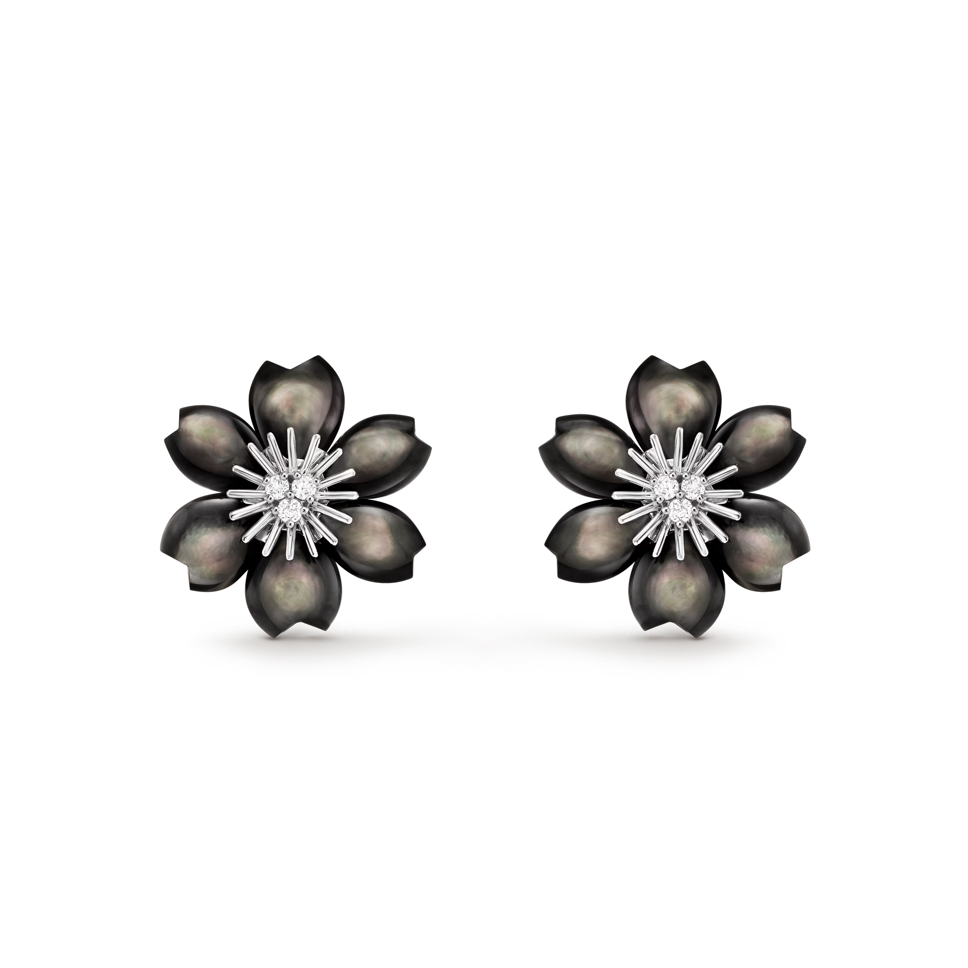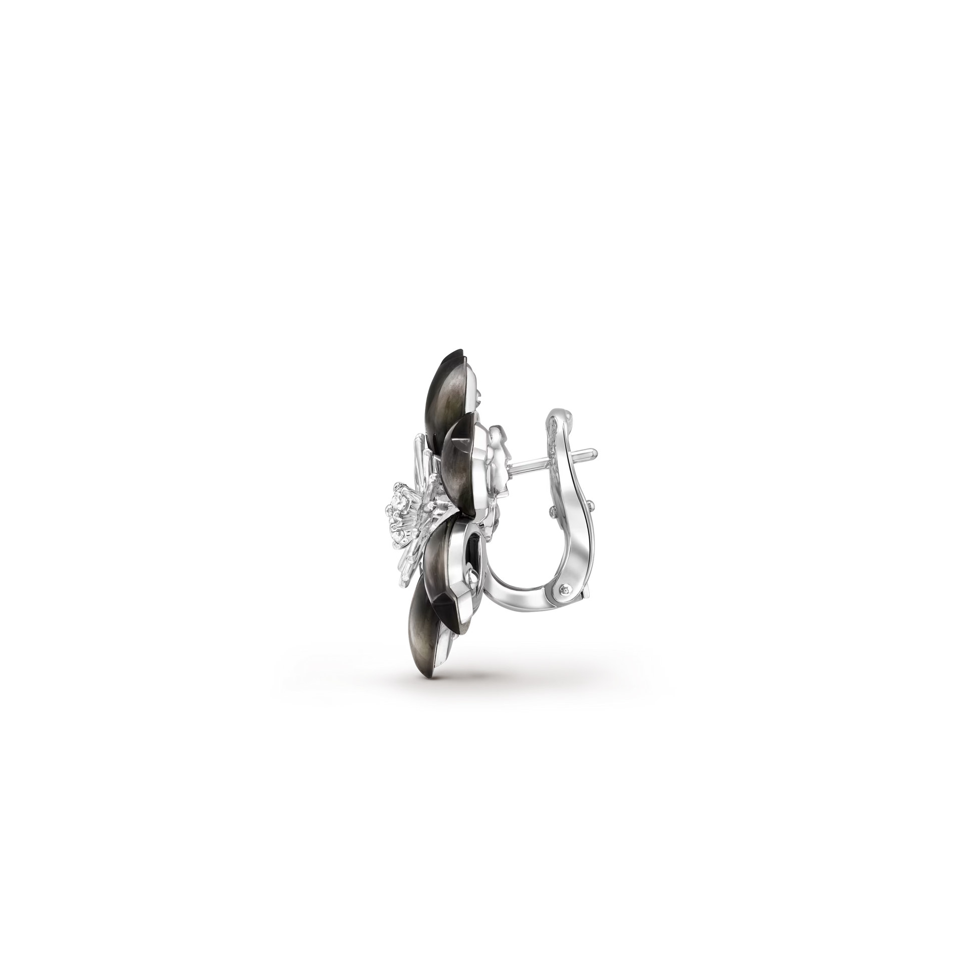 Crafted with rhodium-plated 18K white gold, highlighting the elegance of gray mother-of-pearl inlays. Enhanced by meticulously set round diamonds, these earrings offer a refined blend of subtle luminosity.