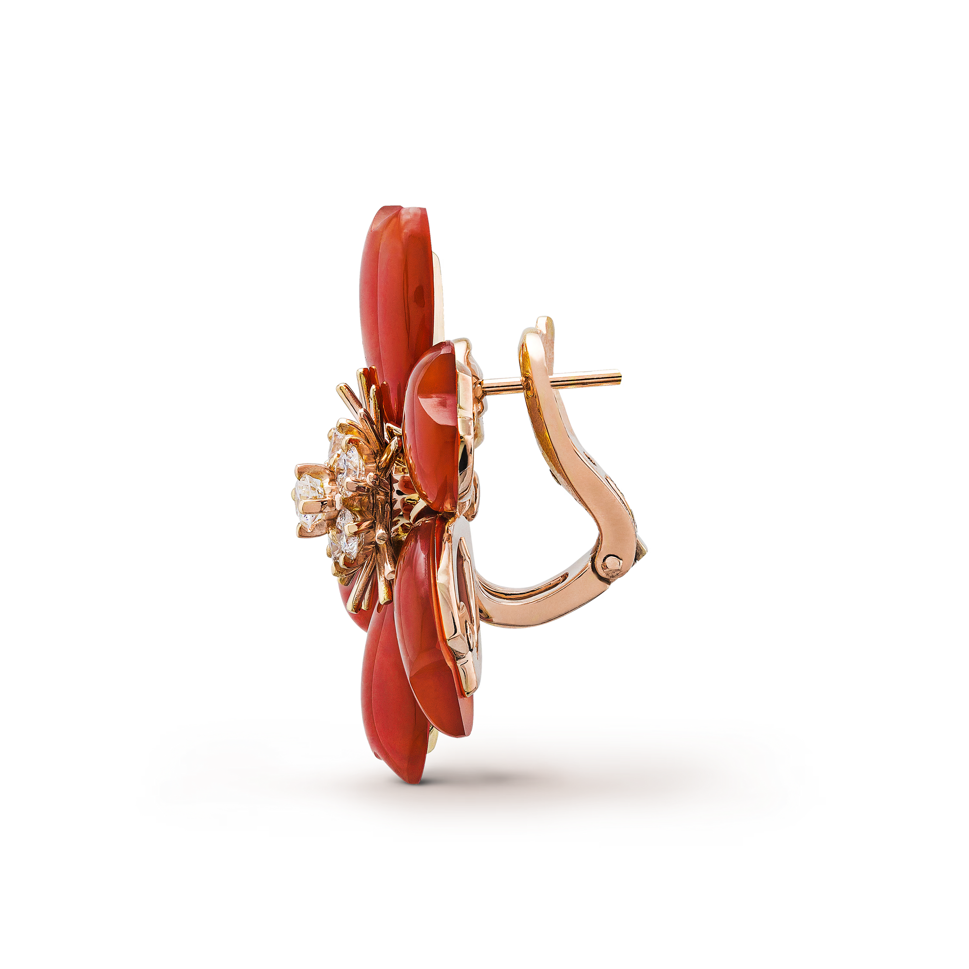 Rose de Noël earrings, small model, 18K rose gold, carnelian, round diamonds.