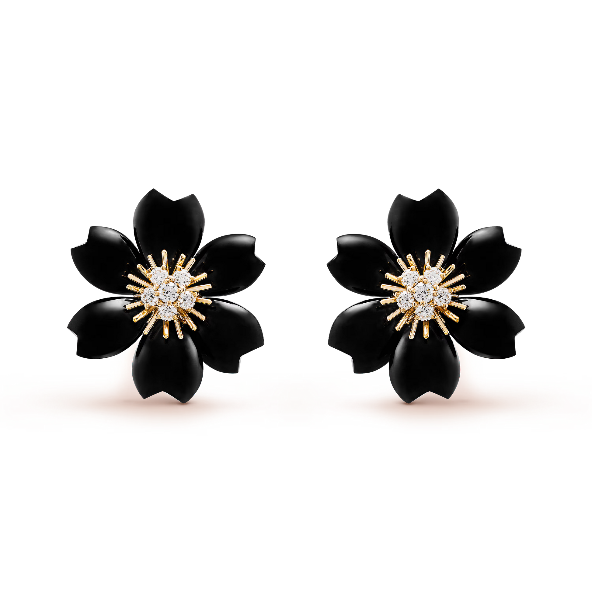 These Rose de Noël small model earrings combine the warmth of 18K yellow gold with the deep elegance of onyx, accentuated by sparkling round diamonds.