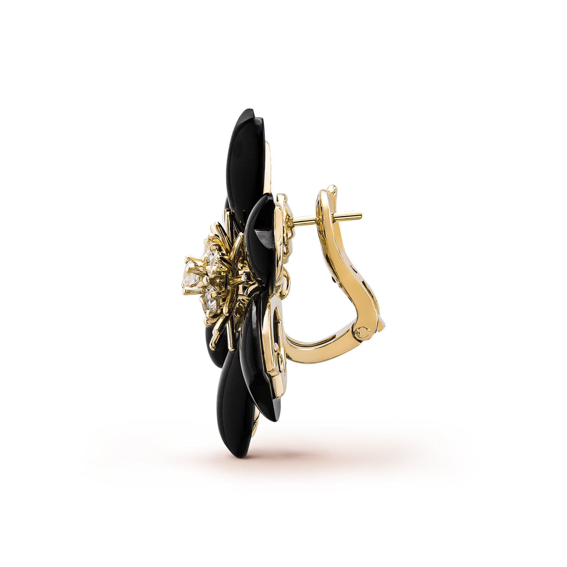 Rose de Noël earrings, small model, 18K yellow gold, onyx, round diamonds.