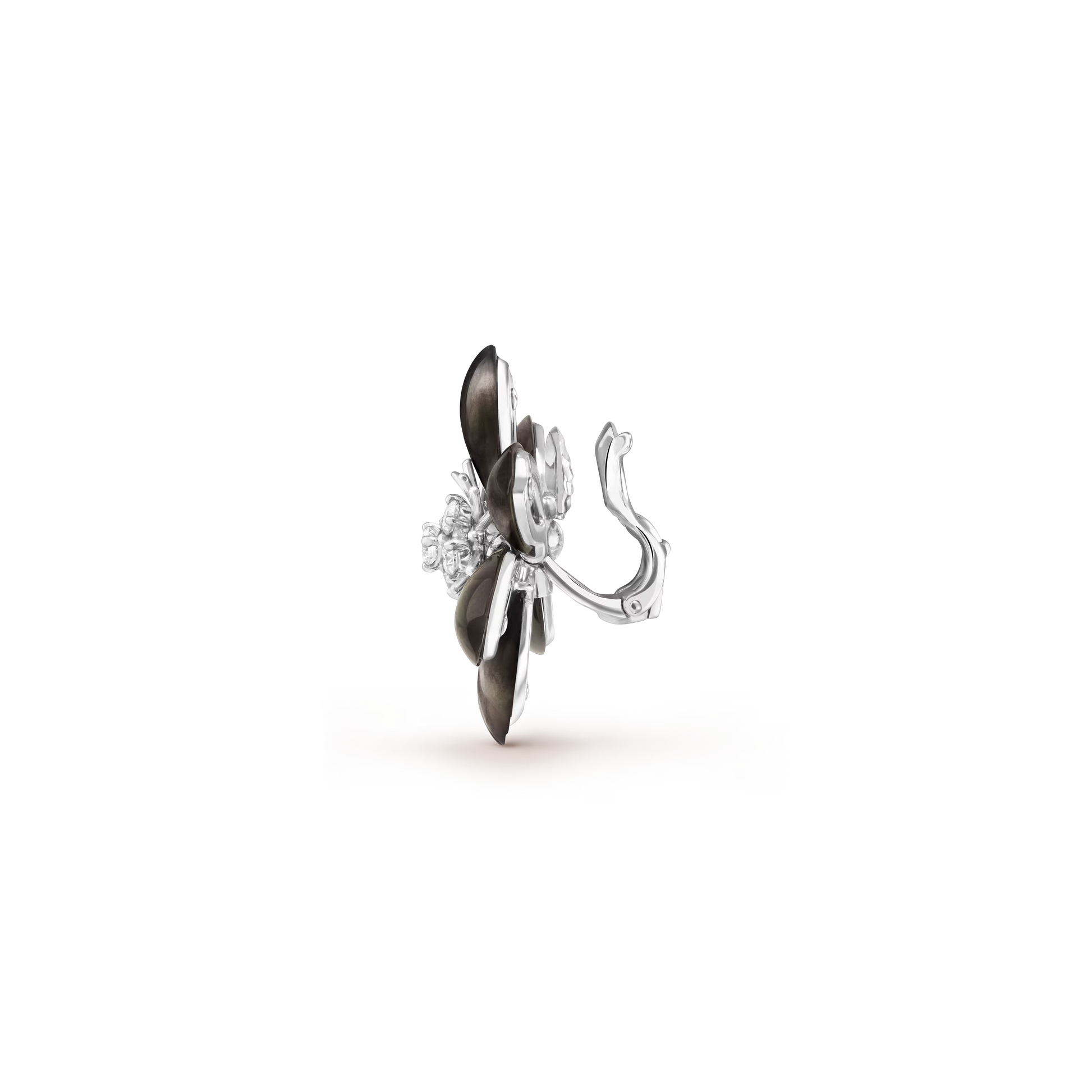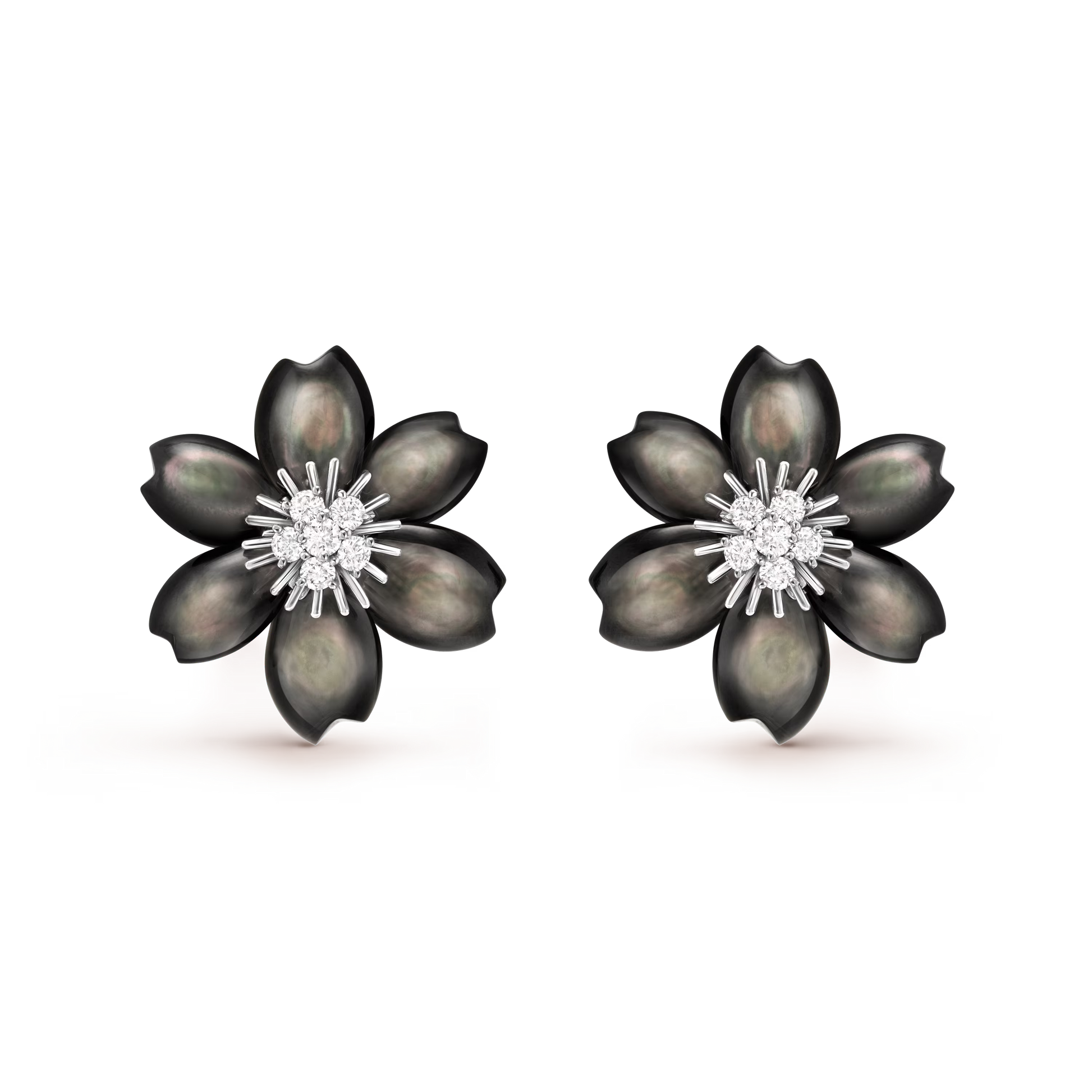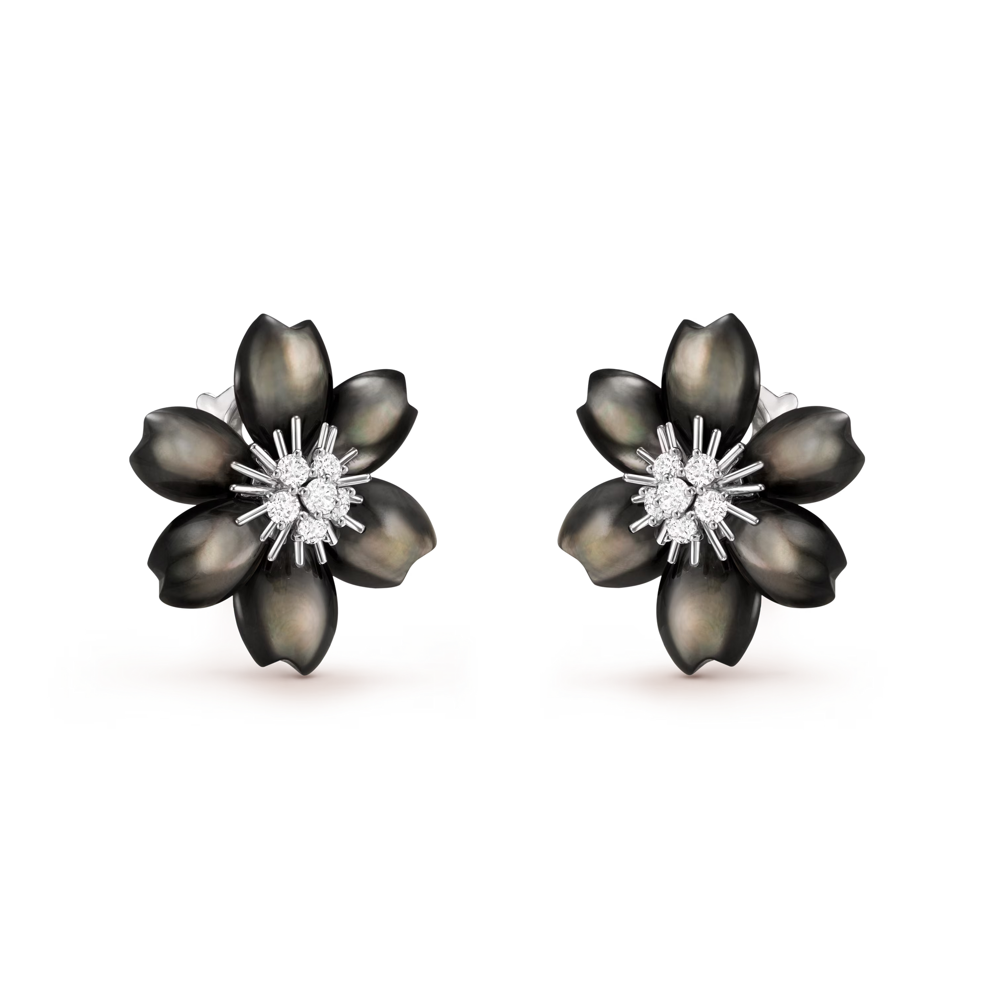 Rose de Noël earrings, small model, rhodium plated 18K white gold, gray mother-of-pearl, round diamonds.