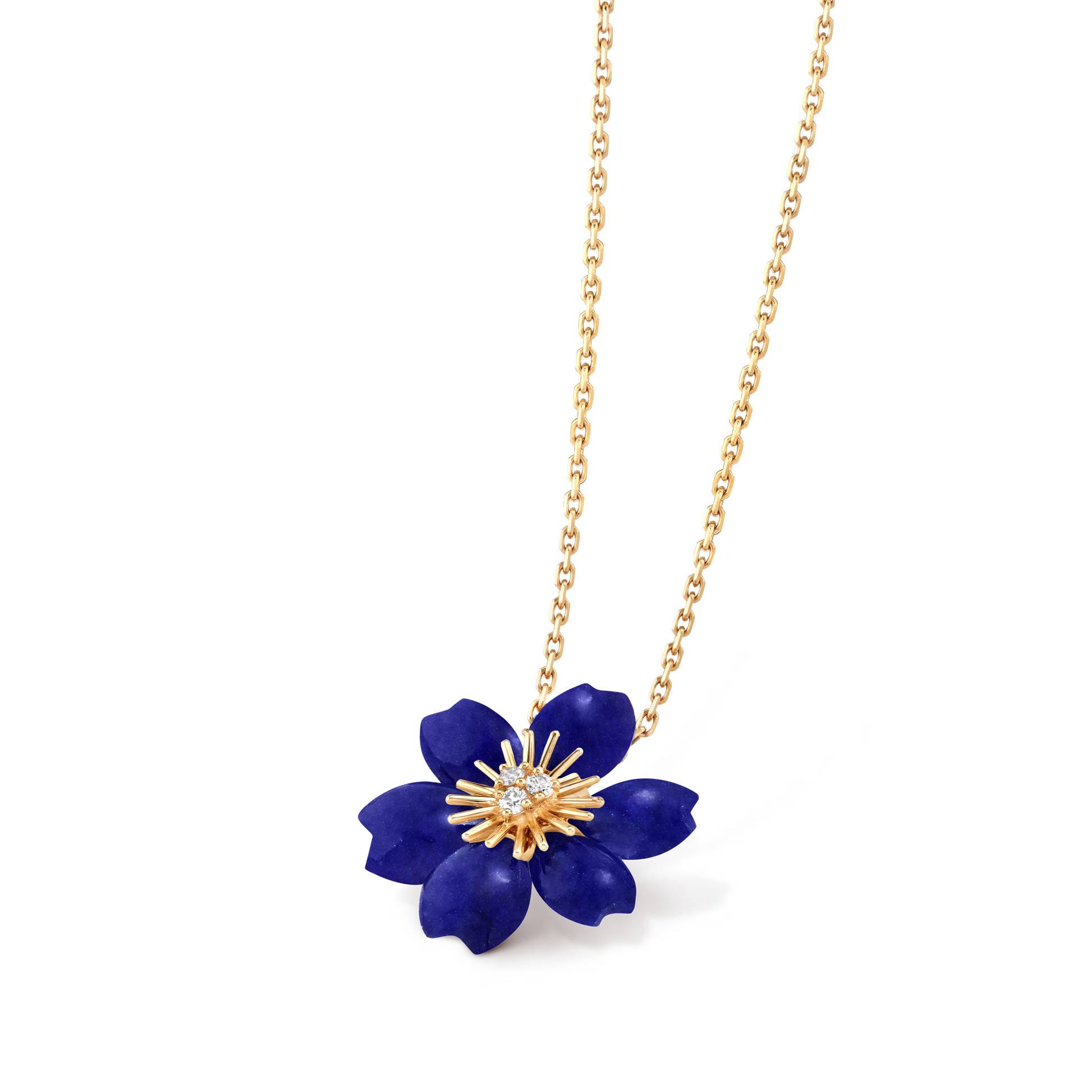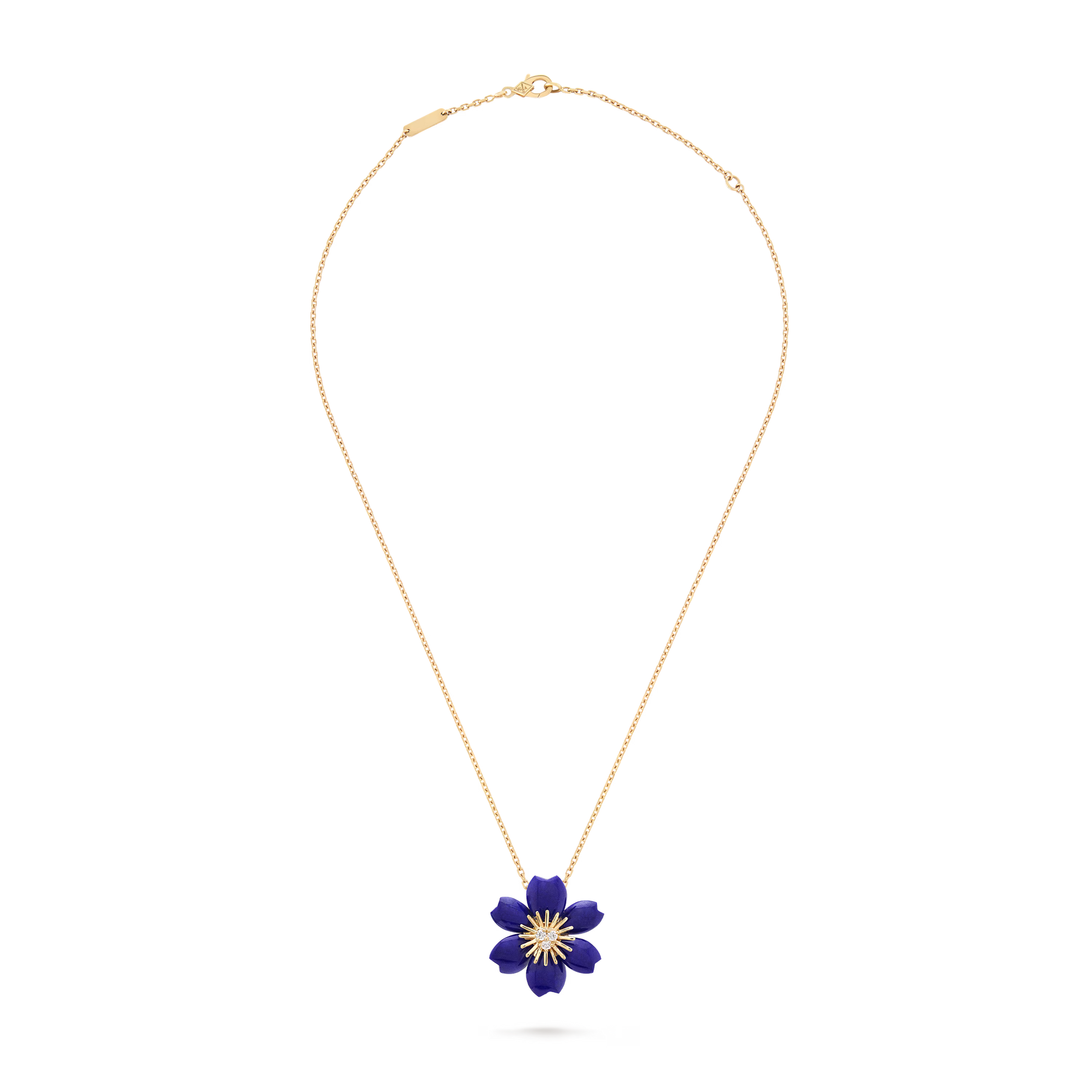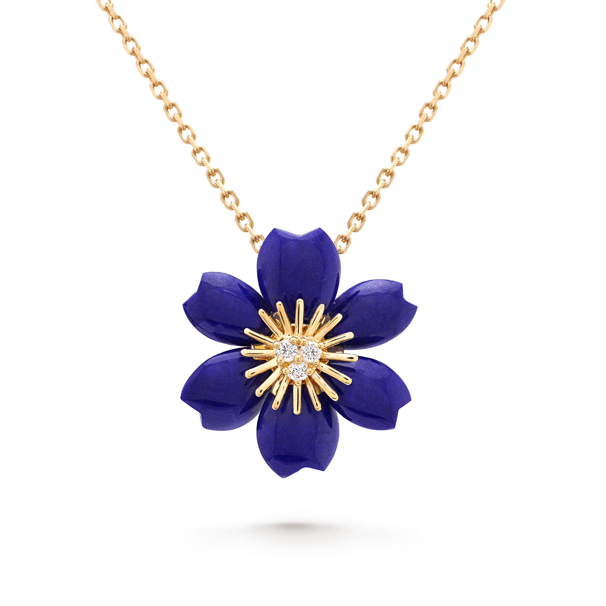Rose de Noël pendant, mini model, 18K yellow gold, lapis lazuli, round diamonds.