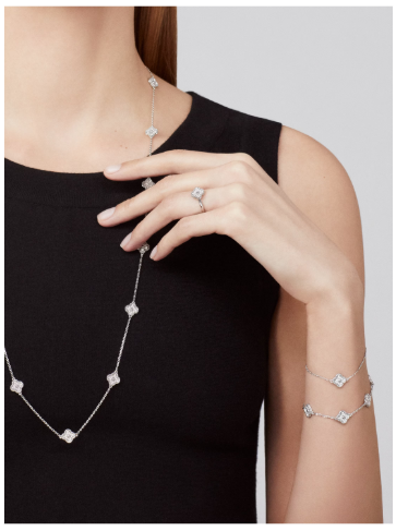 Crafted in rhodium-plated 18K white gold, this Sweet Alhambra bracelet features six delicate clover motifs set with sparkling round diamonds, bringing graceful brilliance to your look.