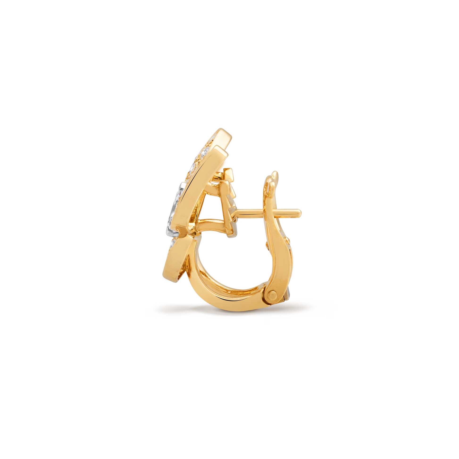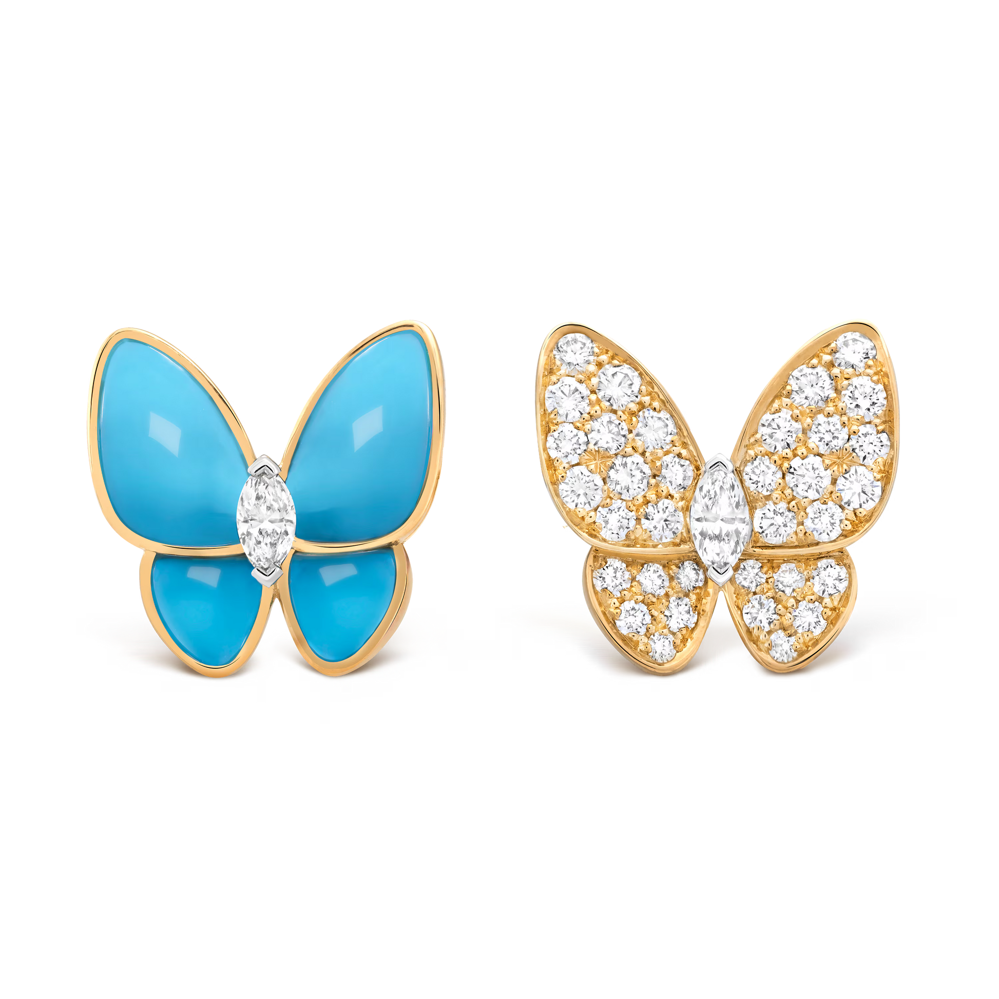 These Two Butterfly earrings expertly combine 18K yellow gold with rhodium-plated 18K white gold, featuring vibrant turquoise stones alongside round and marquise-cut diamonds. The design captures the delicate elegance of butterfly wing.