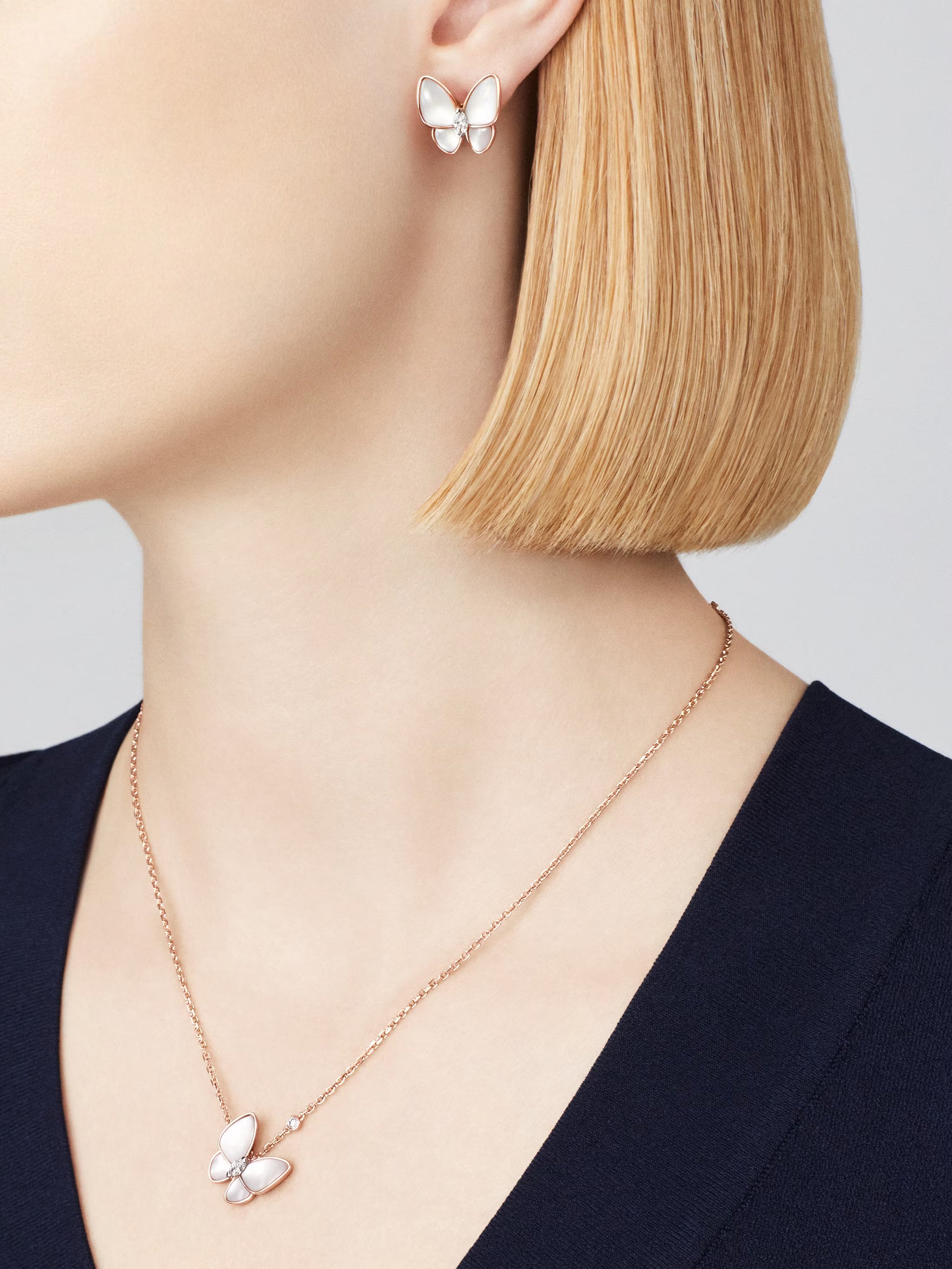 This elegant pendant features two delicately crafted butterflies in 18K rose gold, adorned with white mother-of-pearl accents that add a subtle shimmer.