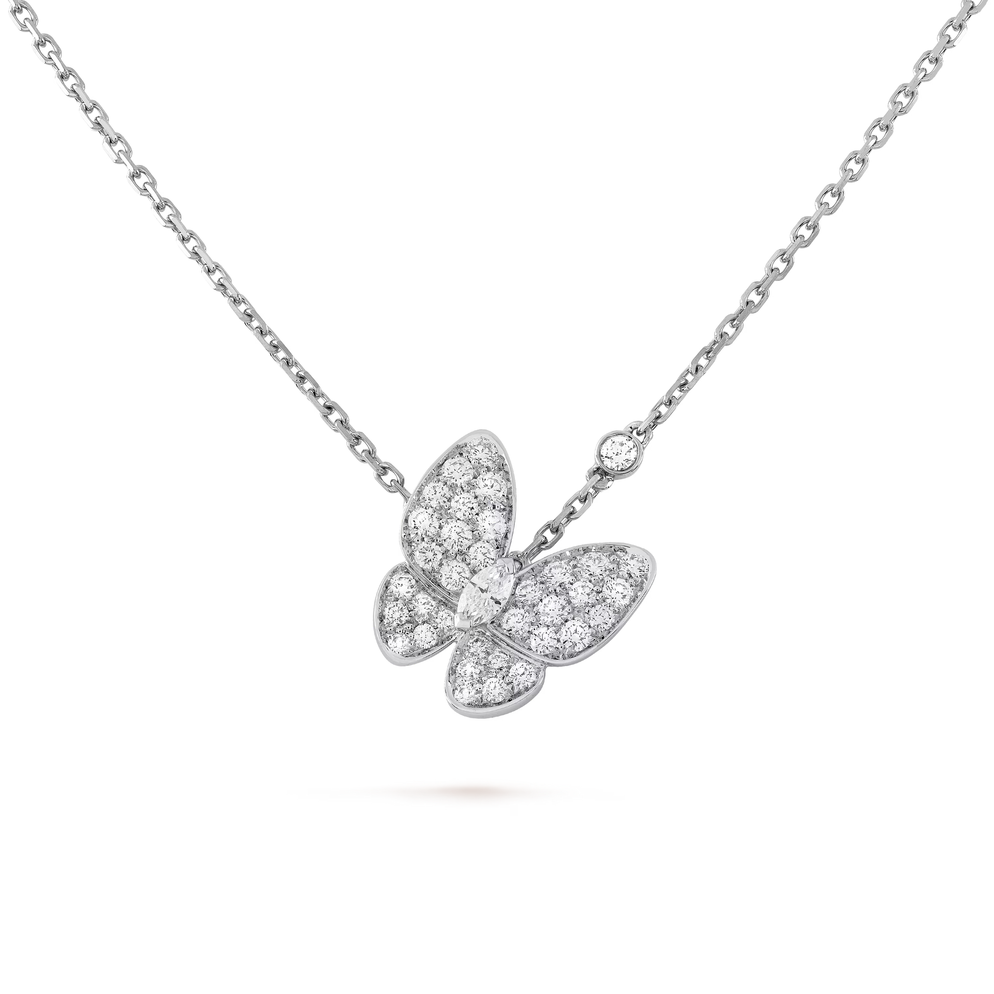 Crafted in rhodium-plated 18K white gold, this Two Butterfly pendant exquisitely combines elegance and sparkle. Featuring a delicate arrangement of round and marquise-cut diamonds.