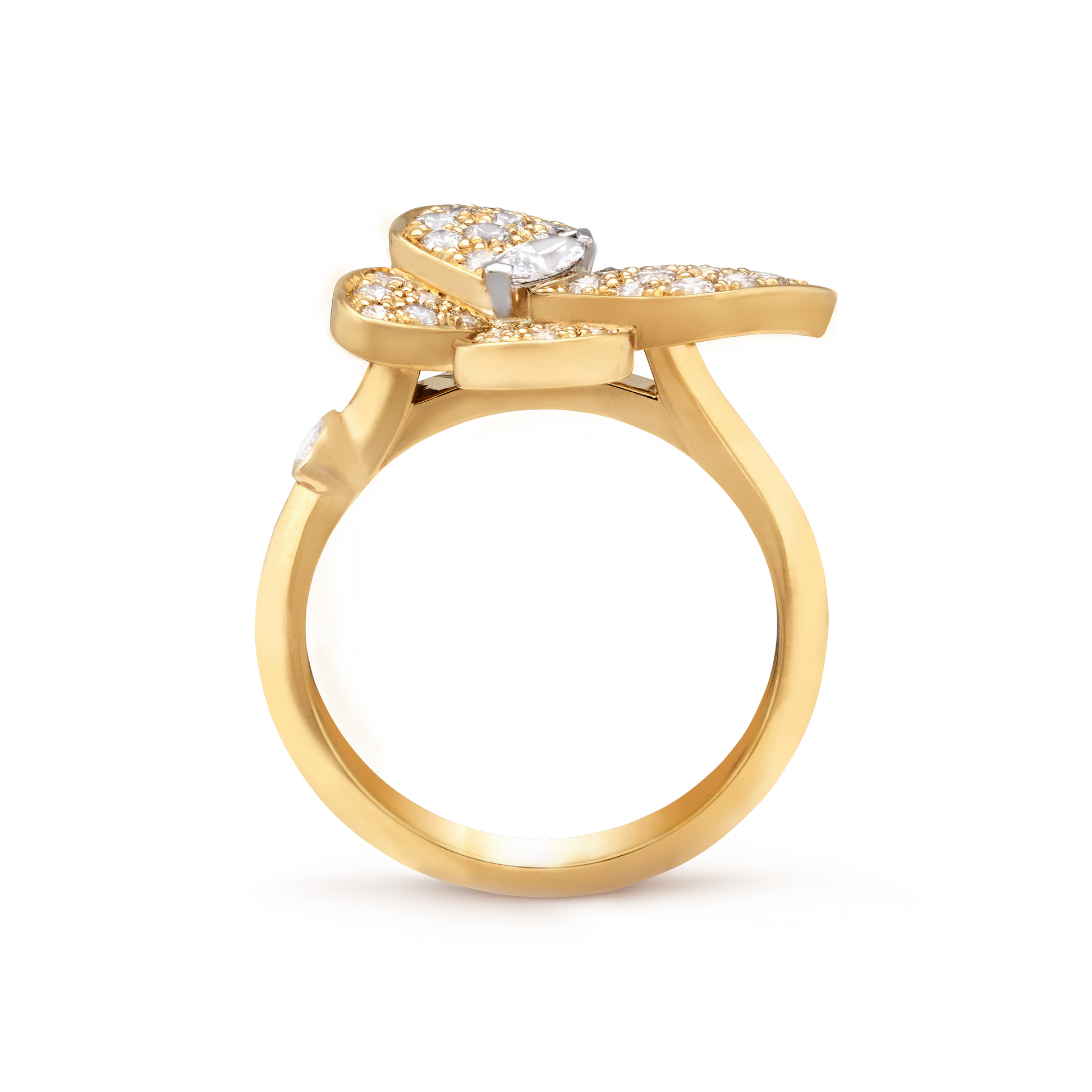 Crafted from 18K yellow gold, adorned with sparkling round diamonds that enhance its graceful design. Accented by rhodium-plated 18K white gold wings set with marquise-cut diamonds.