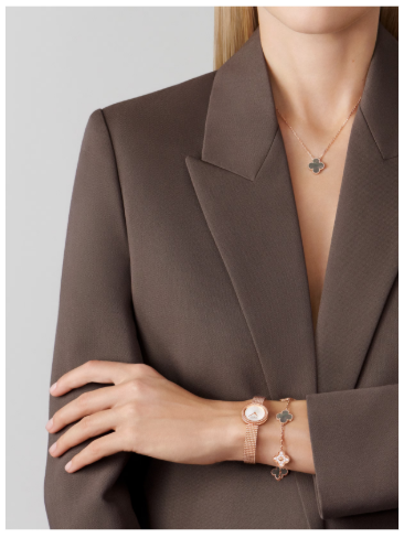 Crafted in 18K rose gold, this Vintage Alhambra bracelet features five iconic clover motifs in shimmering gray mother-of-pearl accented with sparkling diamonds for a luxurious finish.