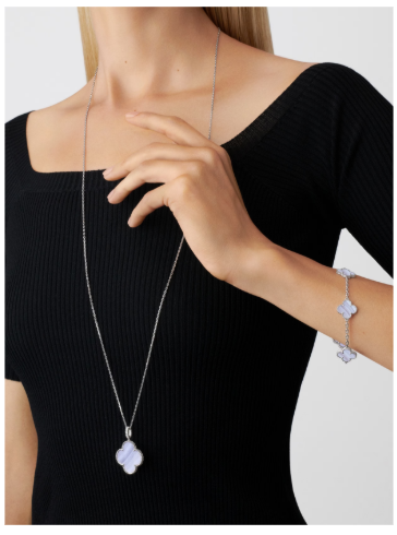 Crafted in 18K white gold, this Vintage Alhambra bracelet features five iconic clover motifs in soft blue chalcedony, radiating serene and timeless elegance.