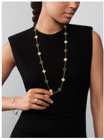Crafted in 18K yellow gold, this Vintage Alhambra bracelet features five iconic clover motifs in rich green malachite accented with sparkling round diamonds for a luxurious touch.