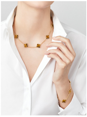 Crafted in 18K yellow gold, this Vintage Alhambra bracelet features five iconic clover motifs in rich tiger’s eye, bringing warmth and timeless elegance to your look.