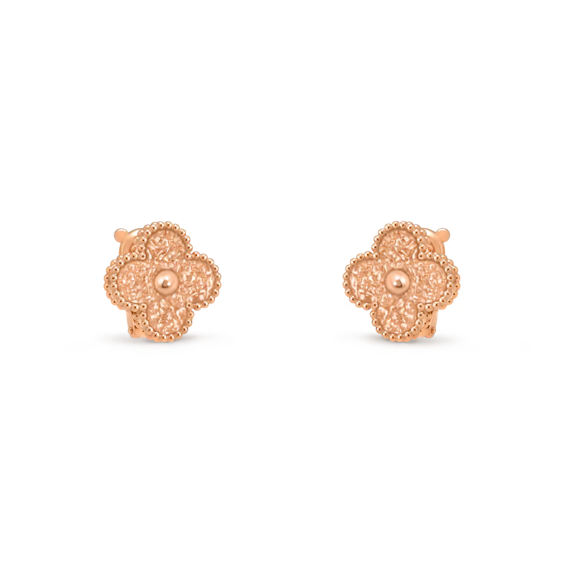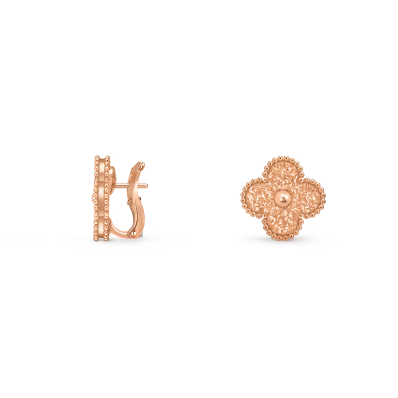 These Vintage Alhambra earrings are crafted in textured 18K rose gold, showcasing the iconic clover motif with a warm and elegant finish.