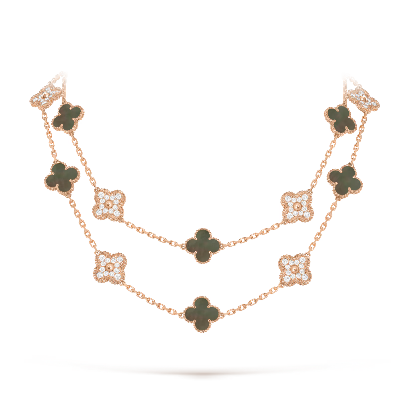 Vintage Alhambra long necklace, 20 motifs, 18K rose gold, gray mother-of-pearl, round diamonds