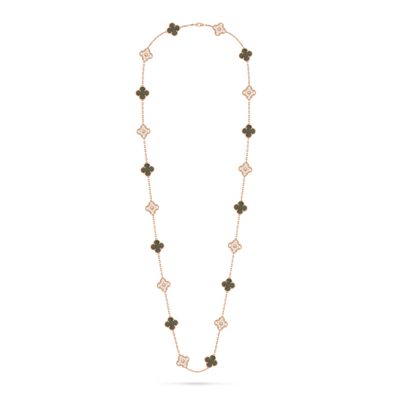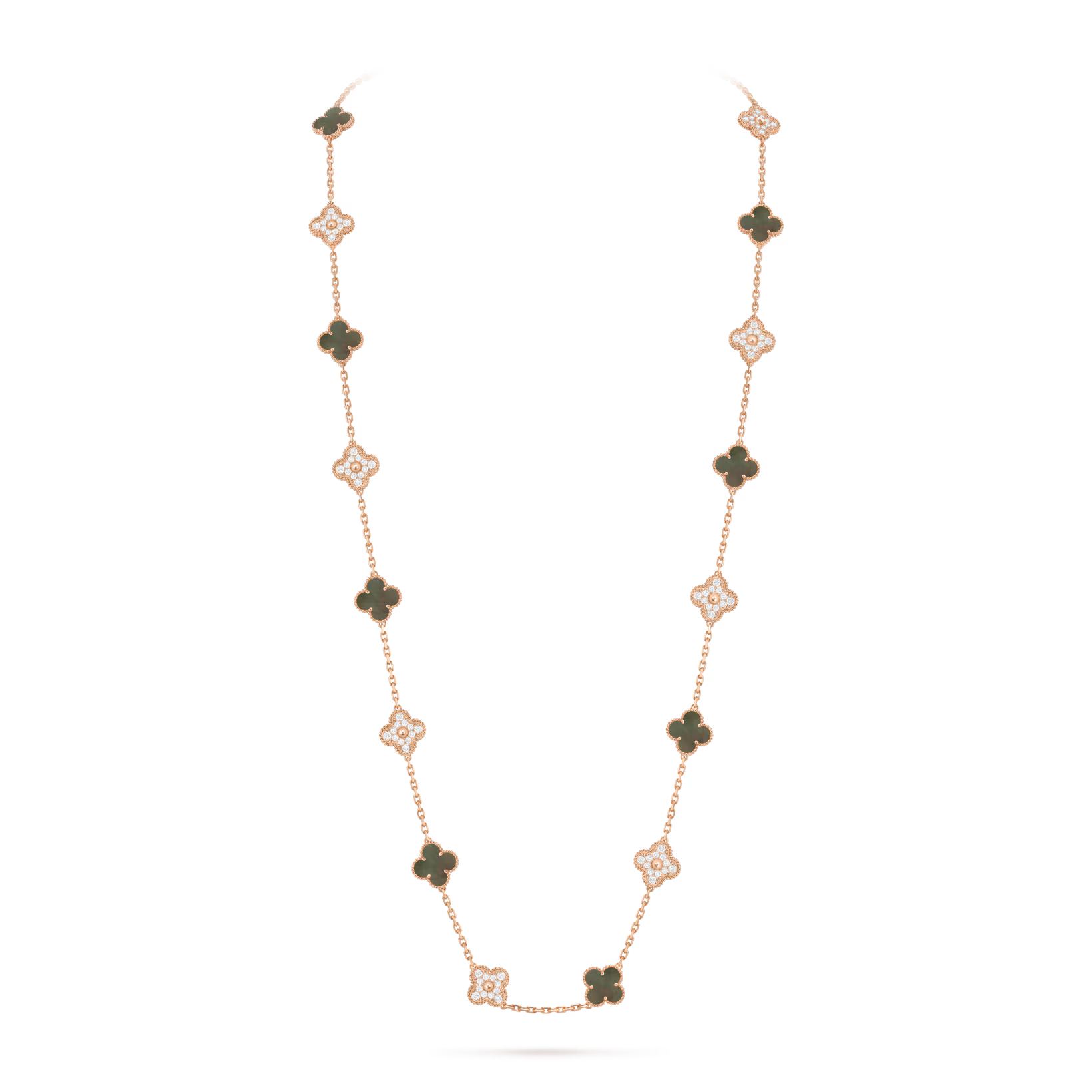 Crafted in 18K rose gold, this Vintage Alhambra long necklace features twenty clover motifs in shimmering gray mother-of-pearl accented with sparkling round diamonds for a luxurious and timeless look.