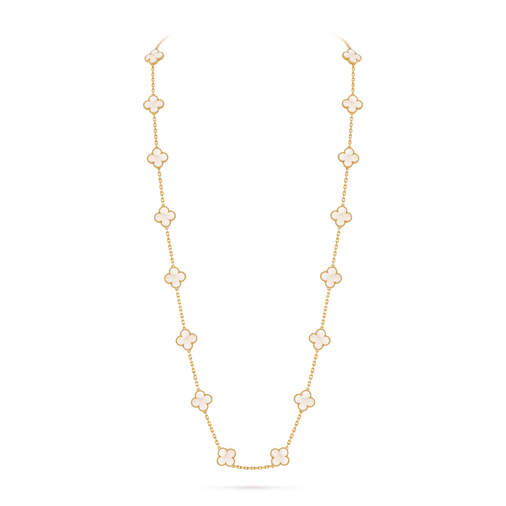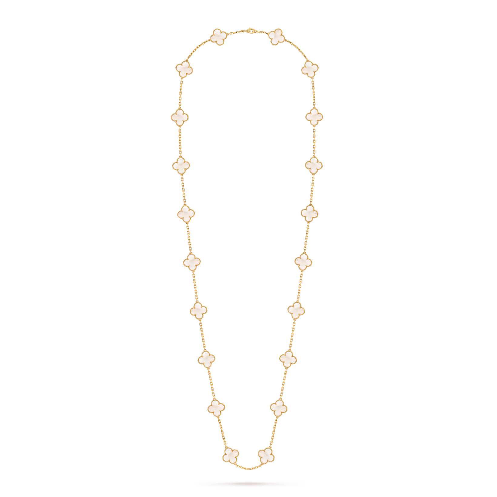Vintage Alhambra long necklace, 20 motifs, 18K yellow gold, white mother-of-pearl.