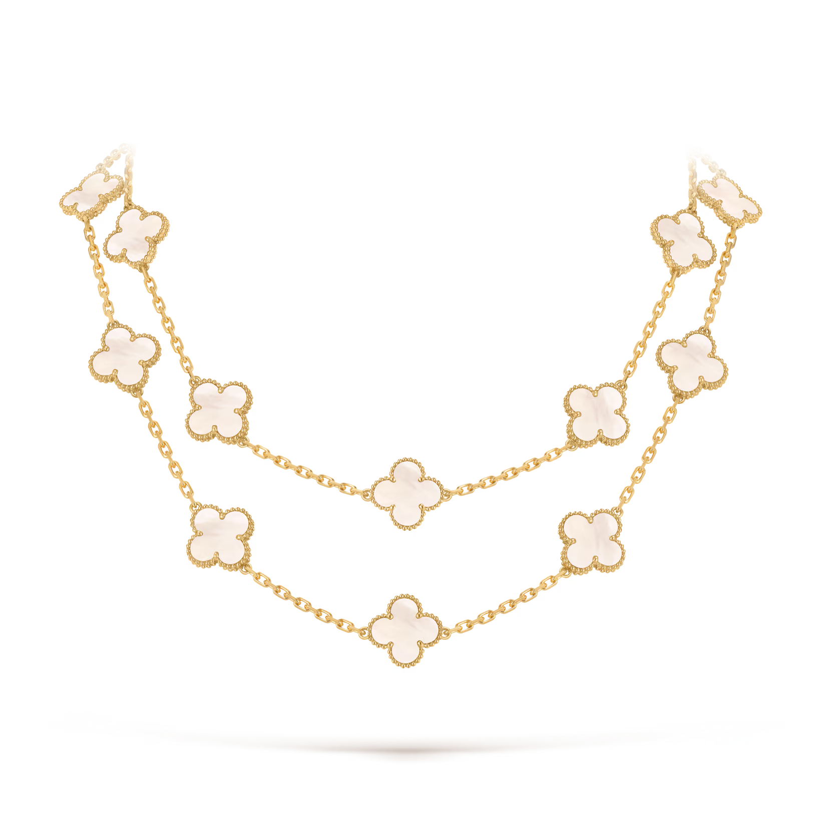 Crafted in 18K yellow gold, this Vintage Alhambra long necklace features twenty luminous white mother-of-pearl clover motifs, radiating timeless beauty and elegance.