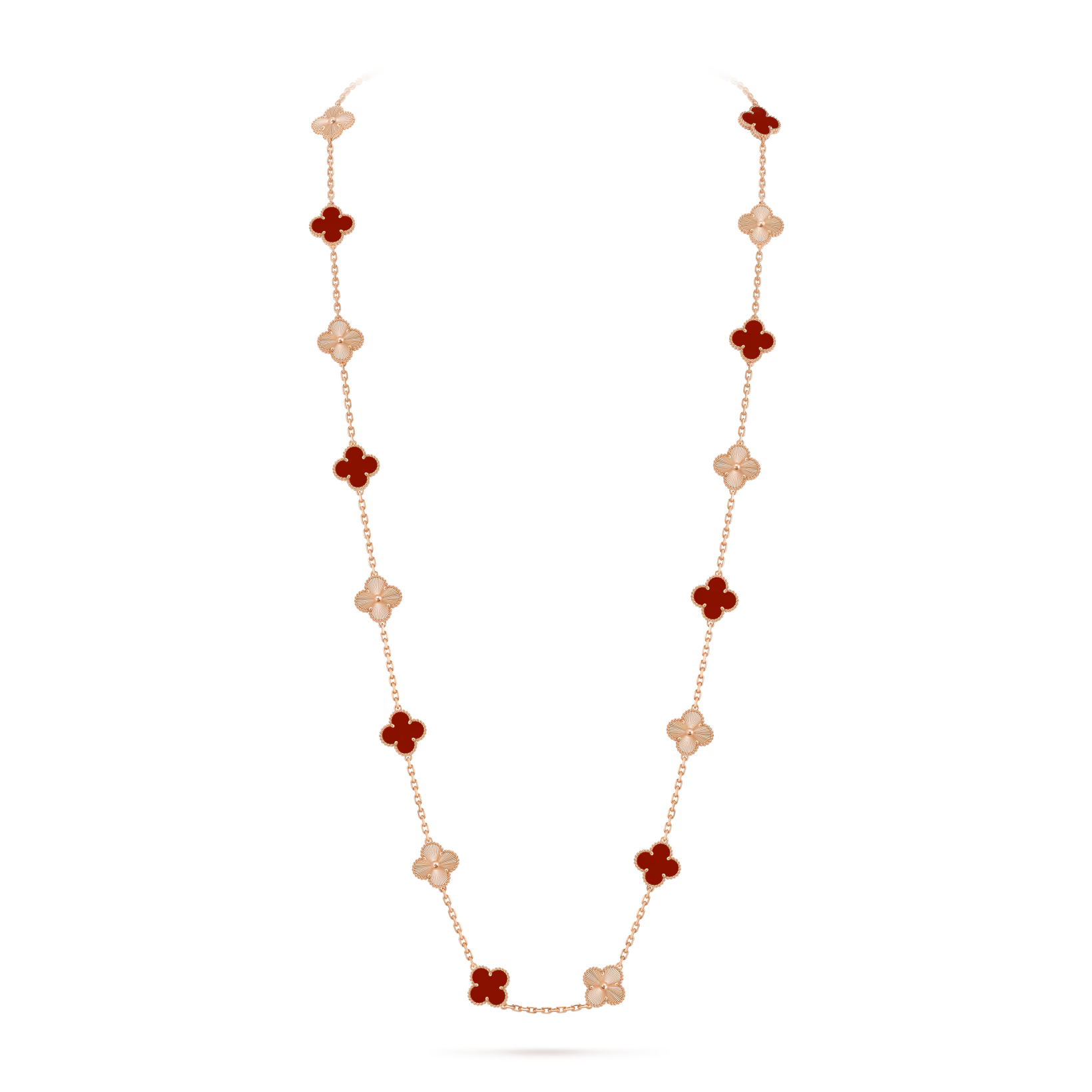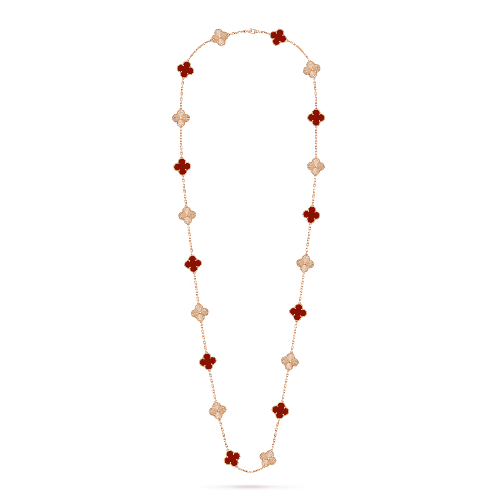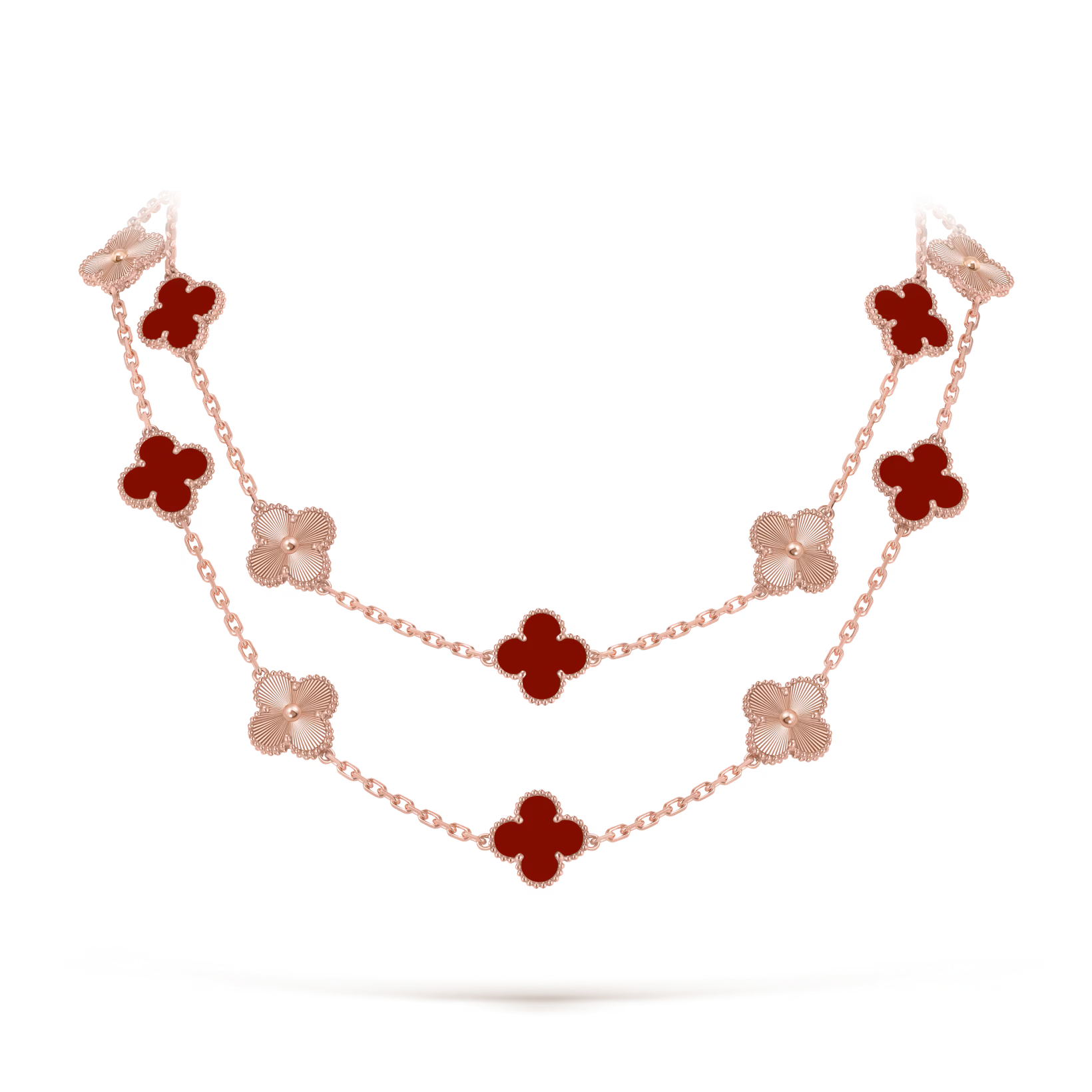 Crafted in guilloché 18K rose gold, this Vintage Alhambra long necklace features twenty clover motifs in vibrant carnelian, blending rich color with radiant sunburst detailing.